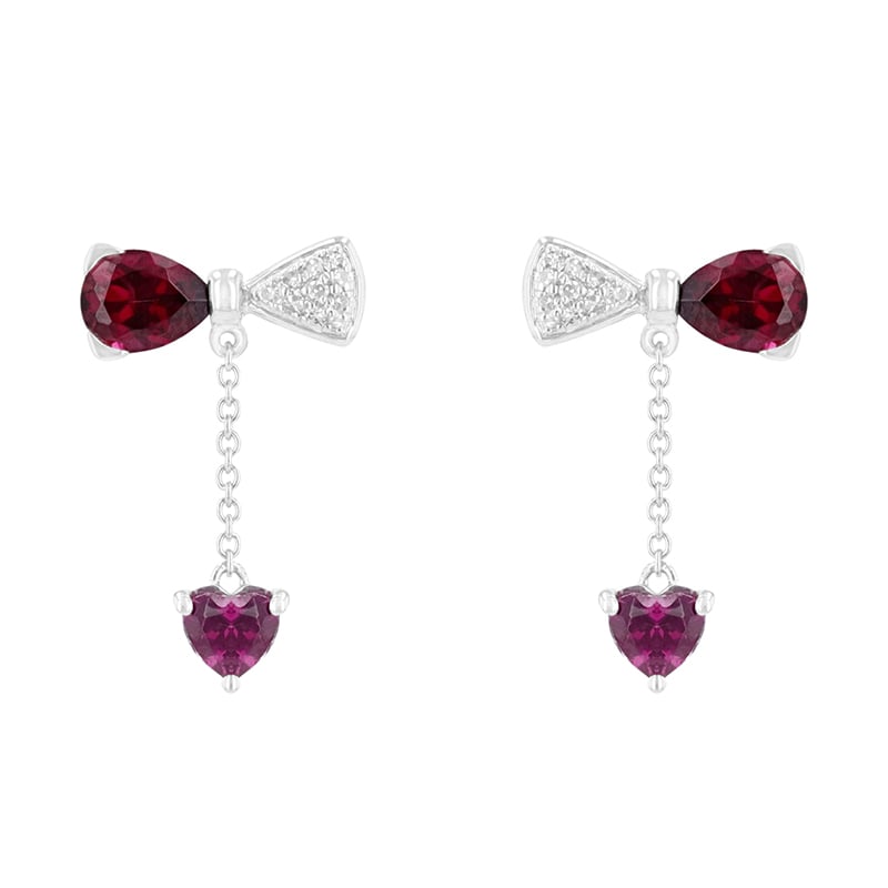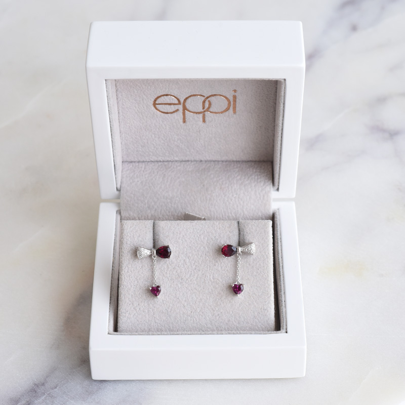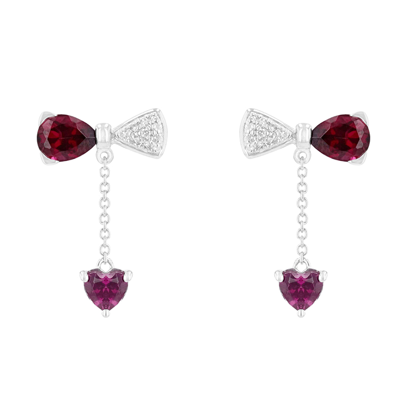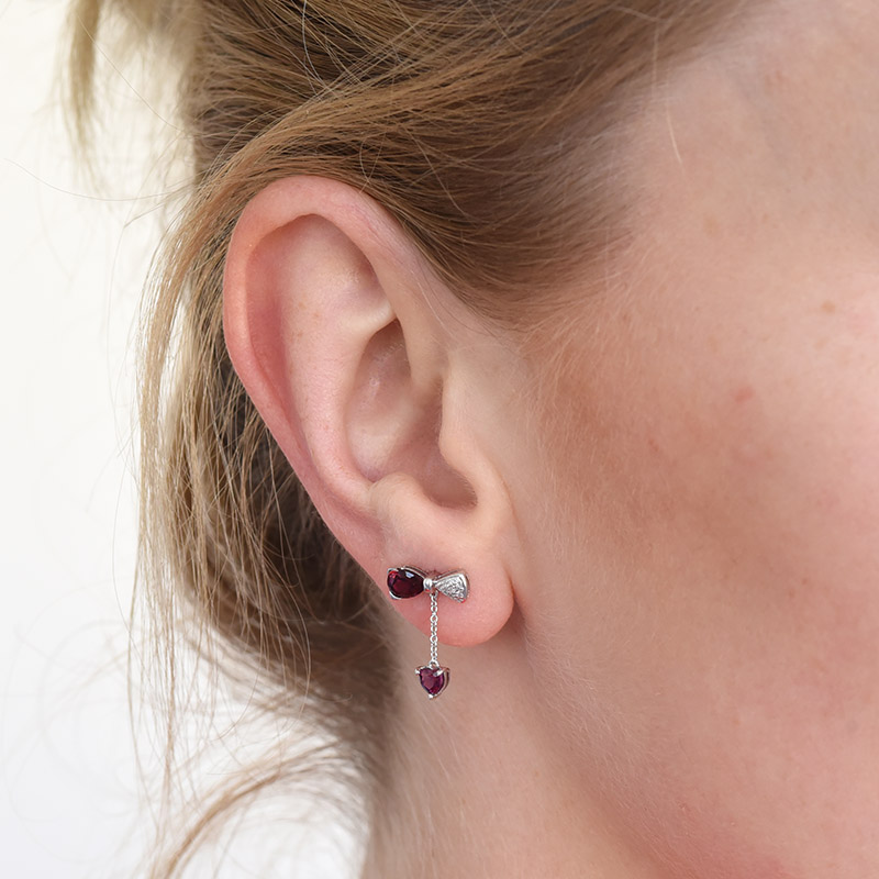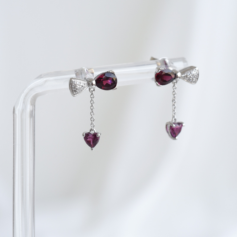 • die raffinierte Kombination von Schleifchen und Herz wird von violetten Rhodolith Granaten und glänzenden Diamanten geschmückt