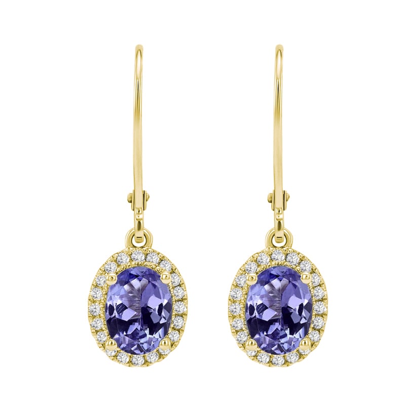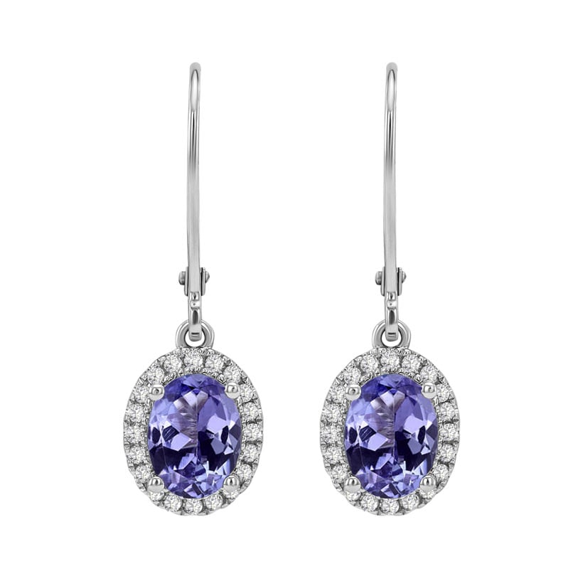 • der zentrale Tansanit von blau-violetter Farbe ist in jedem Ohrring von 20 natürlichen Diamanten umgeben