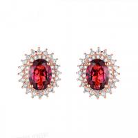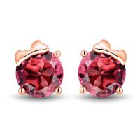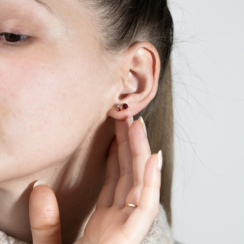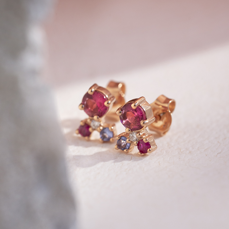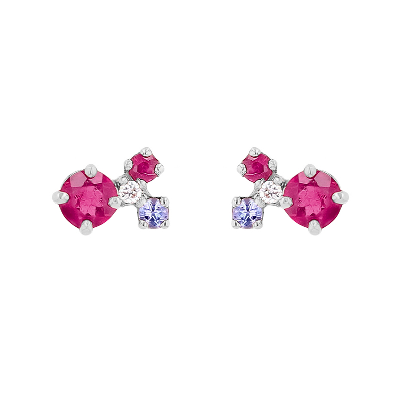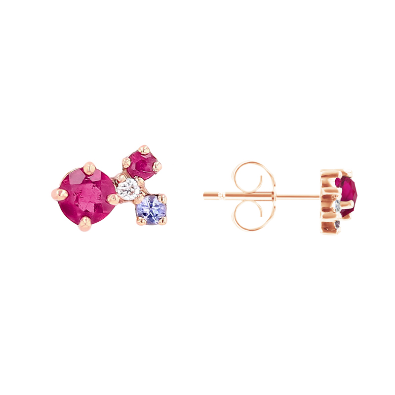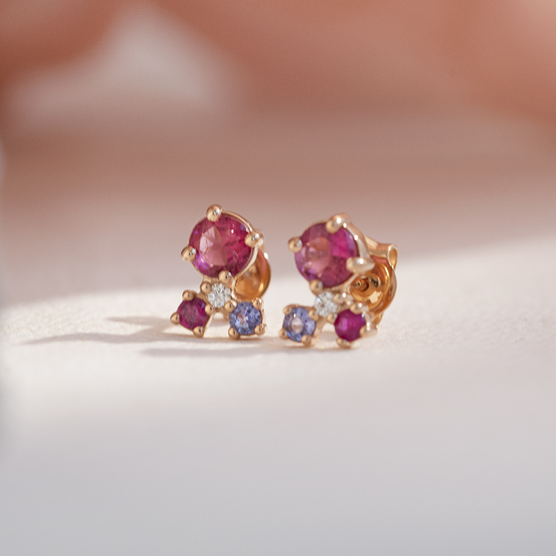 • die Ohrstecker schmücken ein rosa Tansanit, ein roter Rubin, ein violetter Turmalin und ein weißer funkelnder Diamant