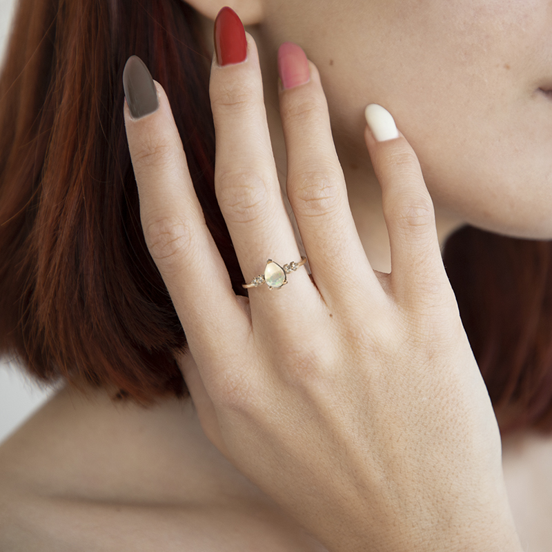 • der zentrale Stein ist ein weißer Opal mit farbigen Reflexen in der beliebten Tropfenform