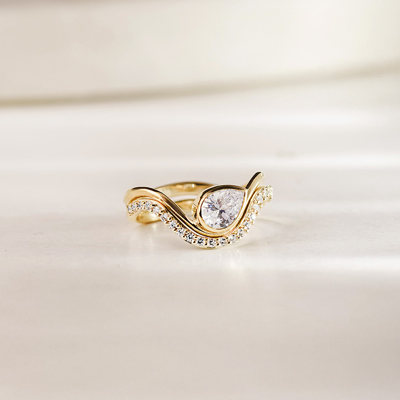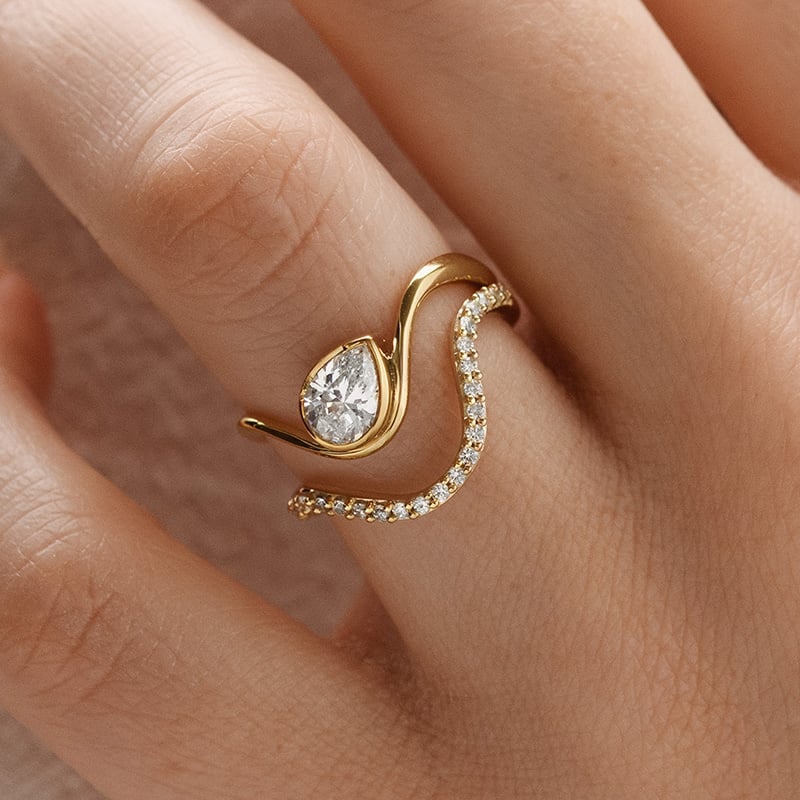 • der originelle Verlobungsring wird von einem tropfenförmigen Lab Grown Diamanten dominiert