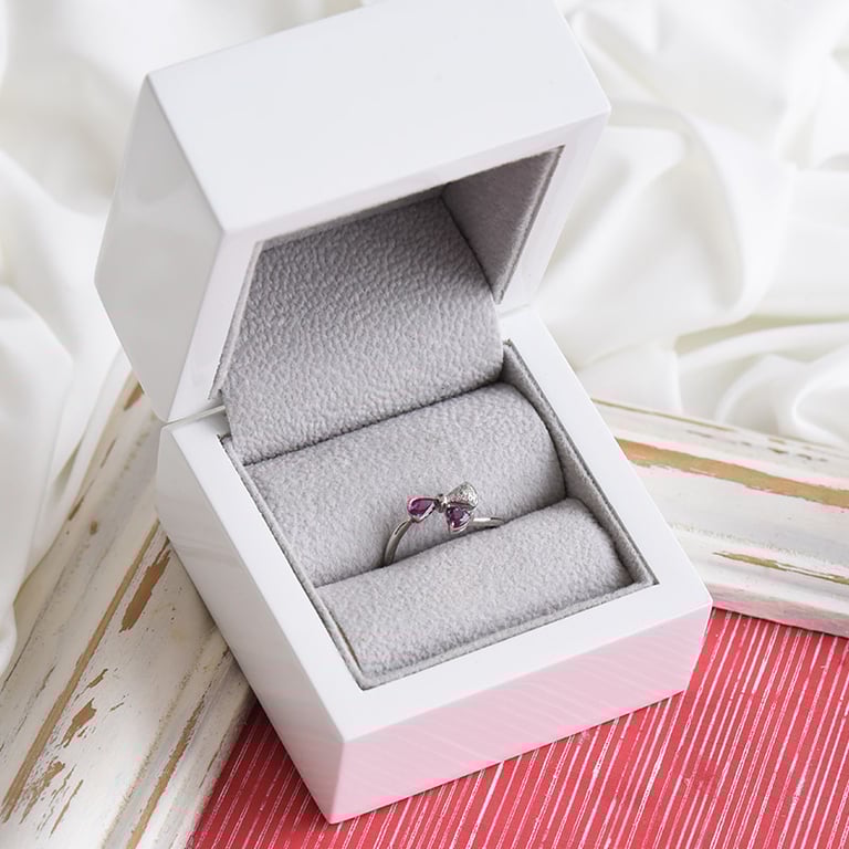 • die aparte Kombination von Schleifchen und Herz wird von violetten Rhodolith Granaten und glänzenden Diamanten geschmückt