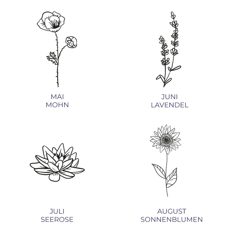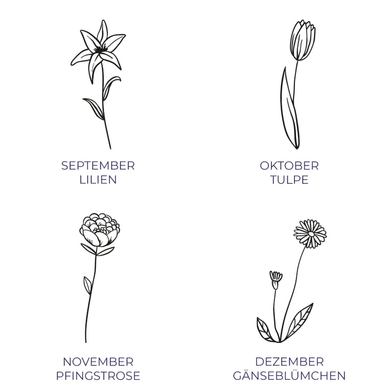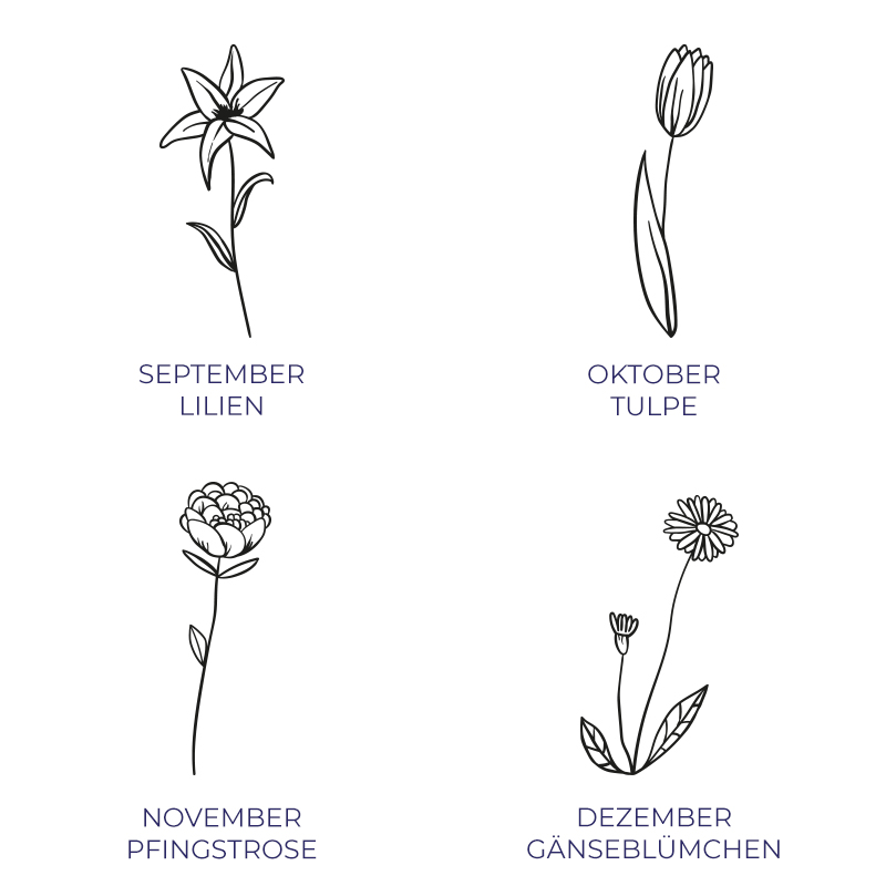 • jedem Monat im Jahr entspricht ein Blumenmotiv, aber es liegt nur an Ihnen, welche Blume Ihnen am meisten gefällt