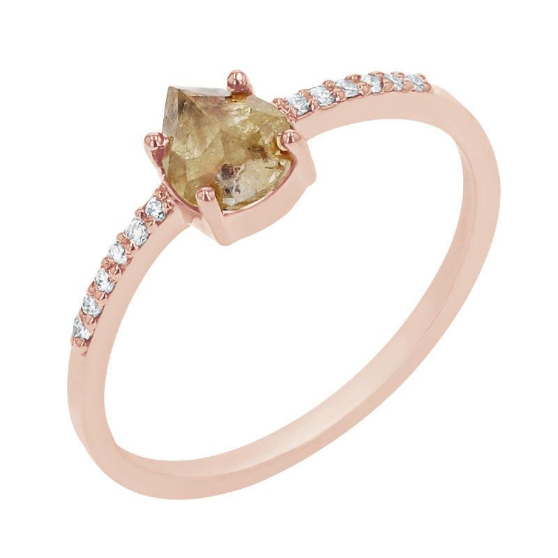 • ein zarter Verlobungsring mit gelbem Salt and Pepper Diamant in Tropfenform und glänzenden Lab Grown Seitendiamanten