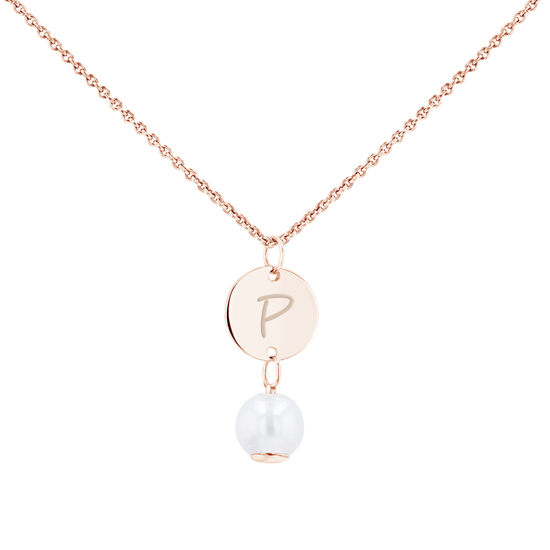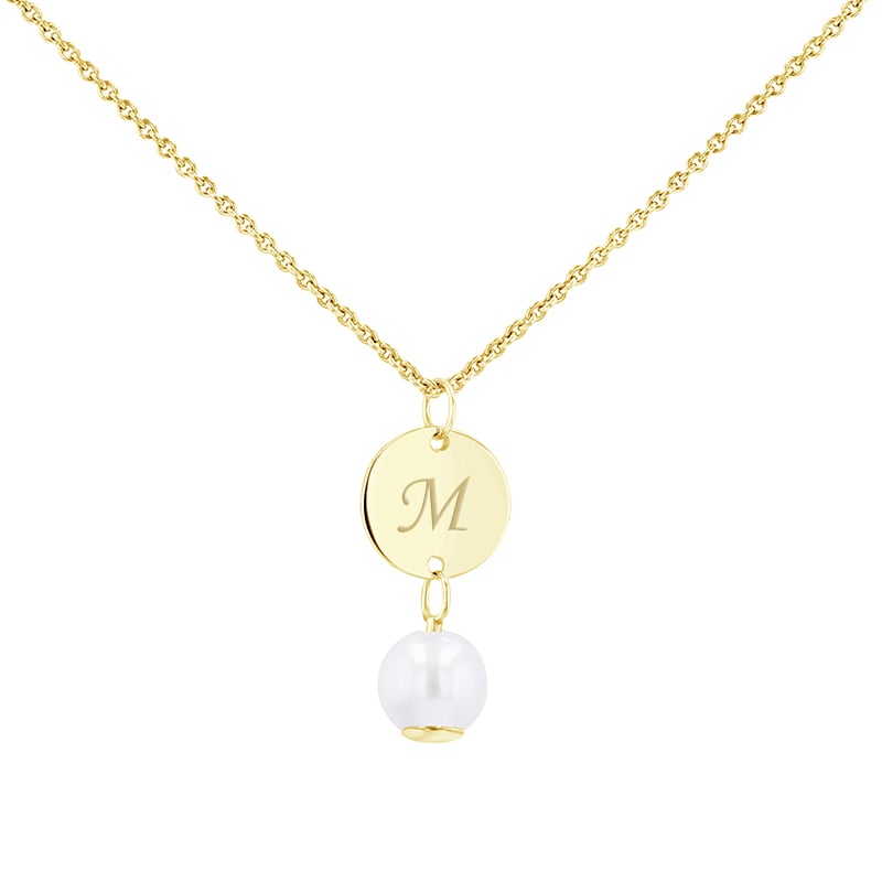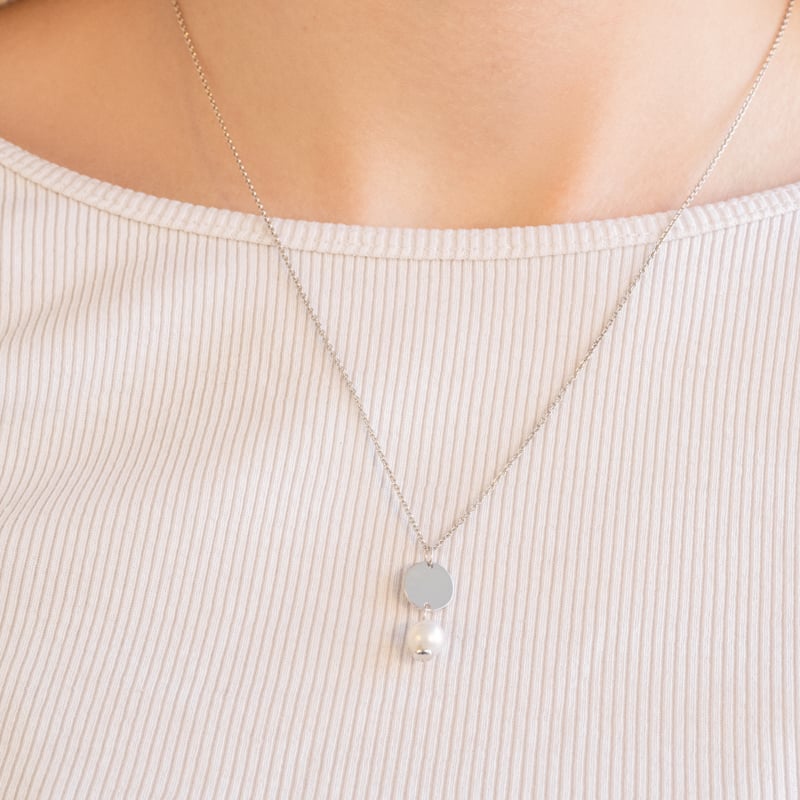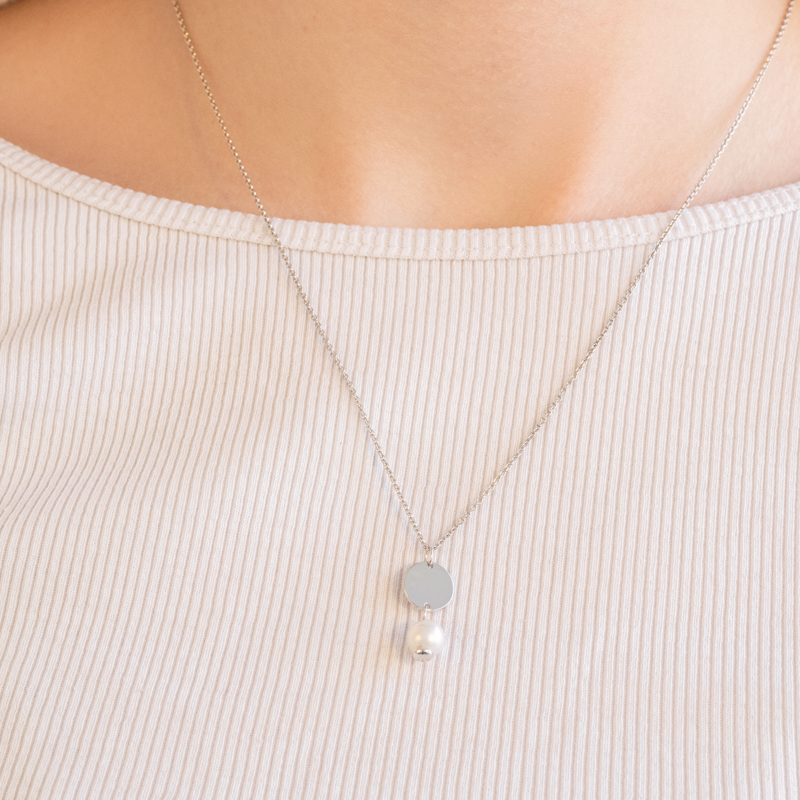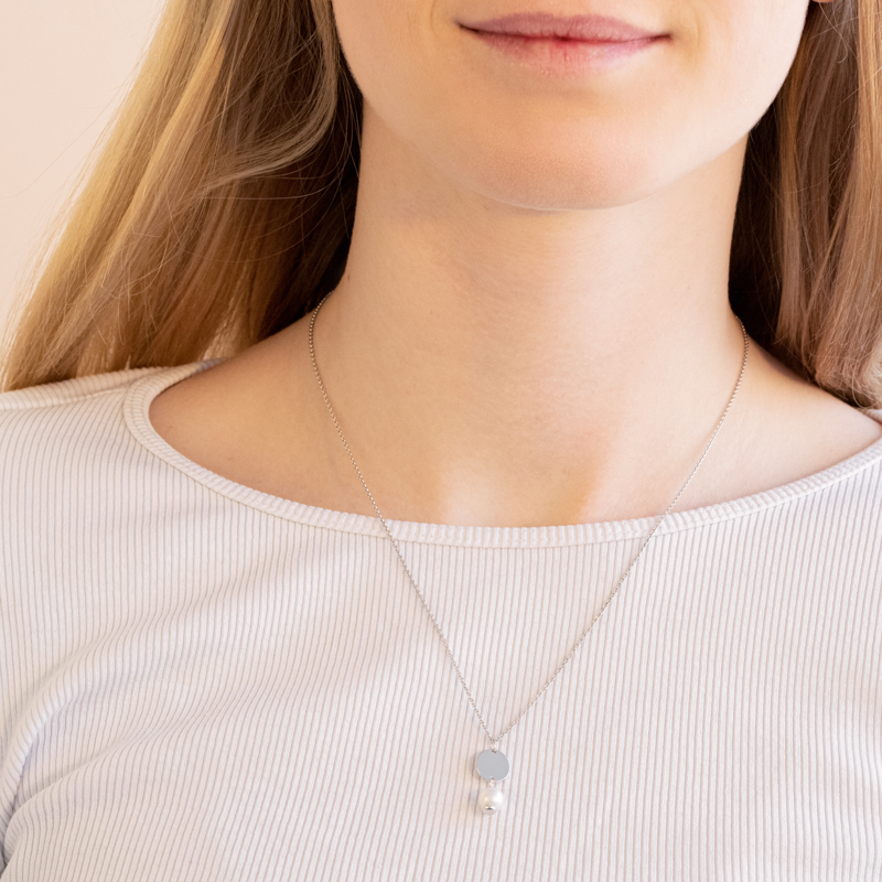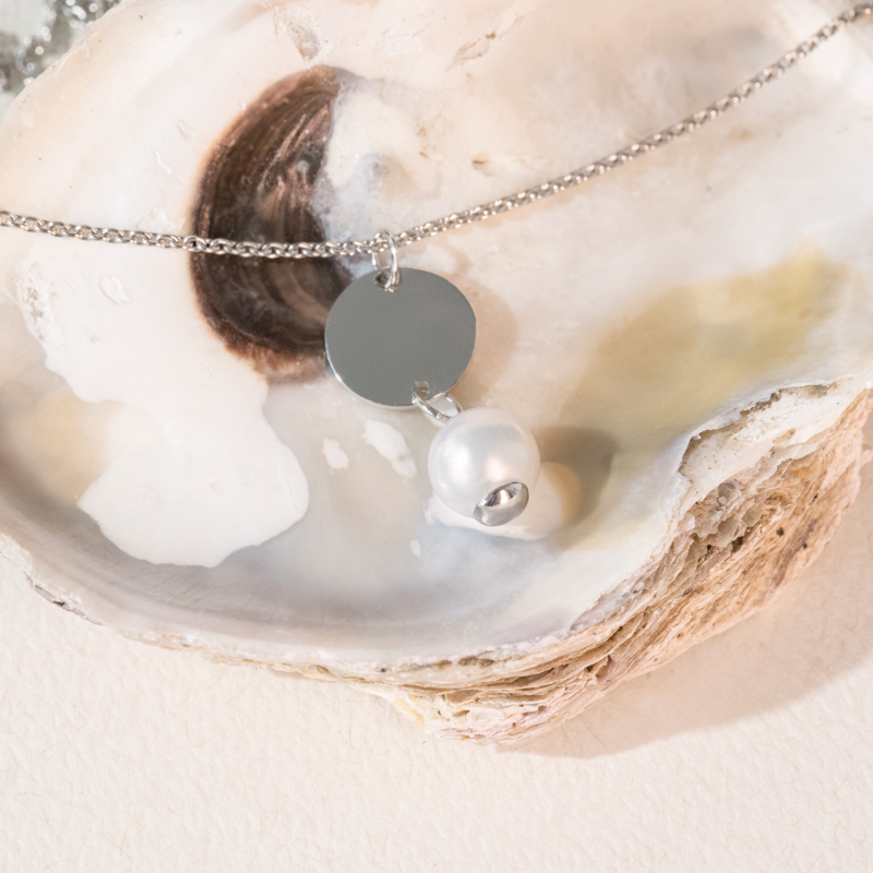• ein unkonventioneller Anhänger aus einer echten weißen Perle und einer runden Scheibe mit Platz für eine Gravur nach Wunsch