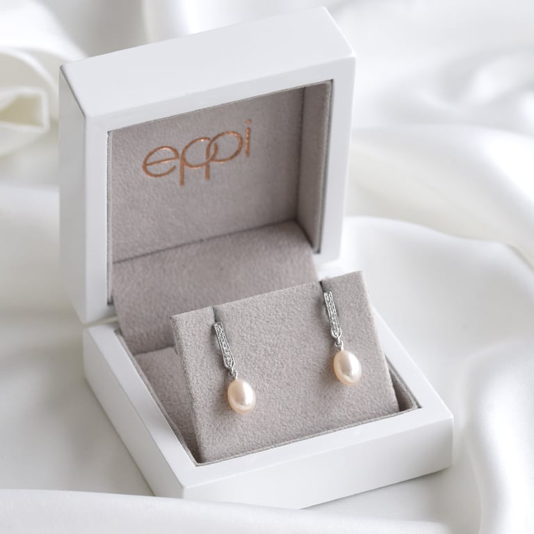 • die eleganten Ohrringe bestehen aus einem diamantbesetzten Stab an dem je eine Südseeperle in zartem rosa-weiß mittels Öse angebracht ist