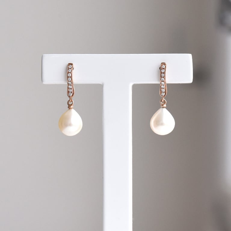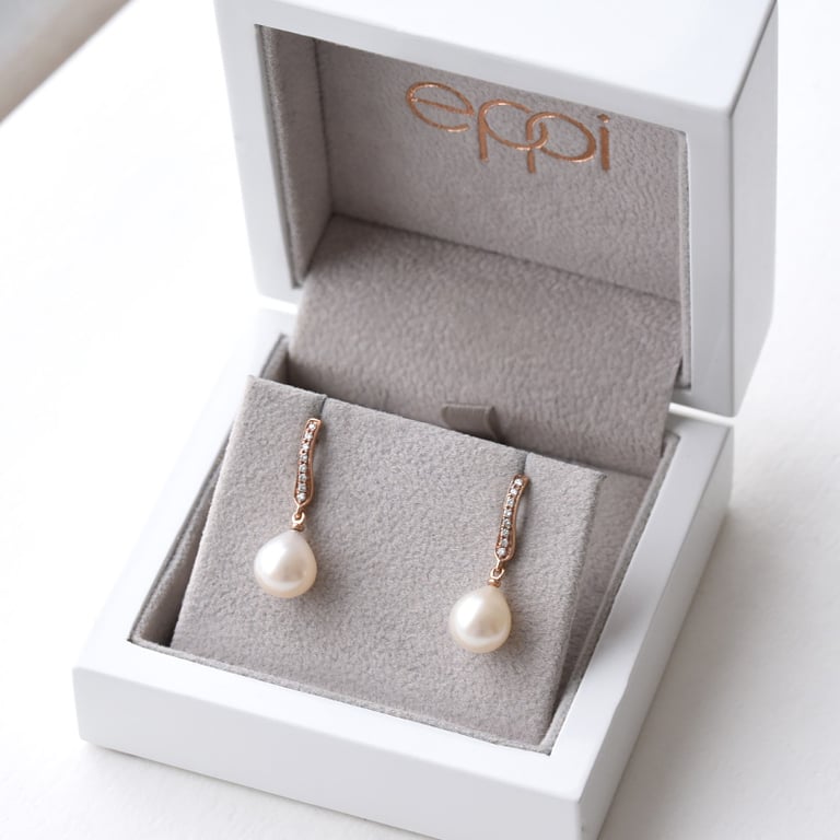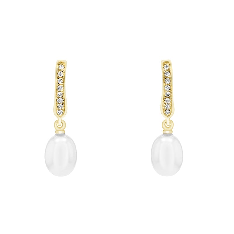 • bei diesen Ohrringen in Gold schimmern eine Diamantenreihe und tropfenförmige Perlen um die Wette