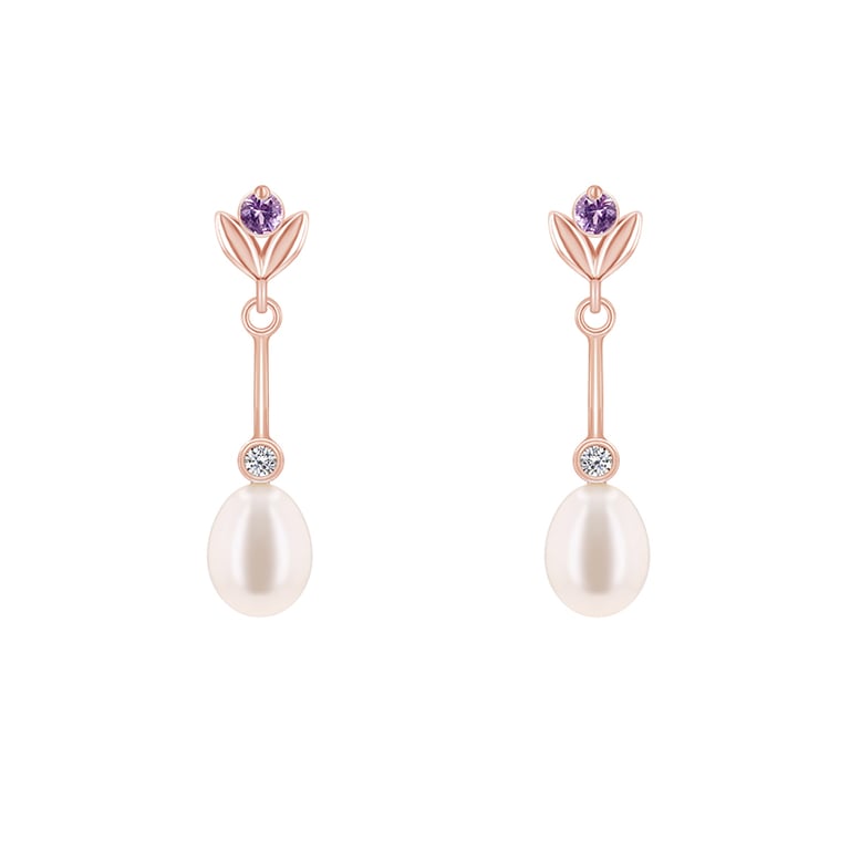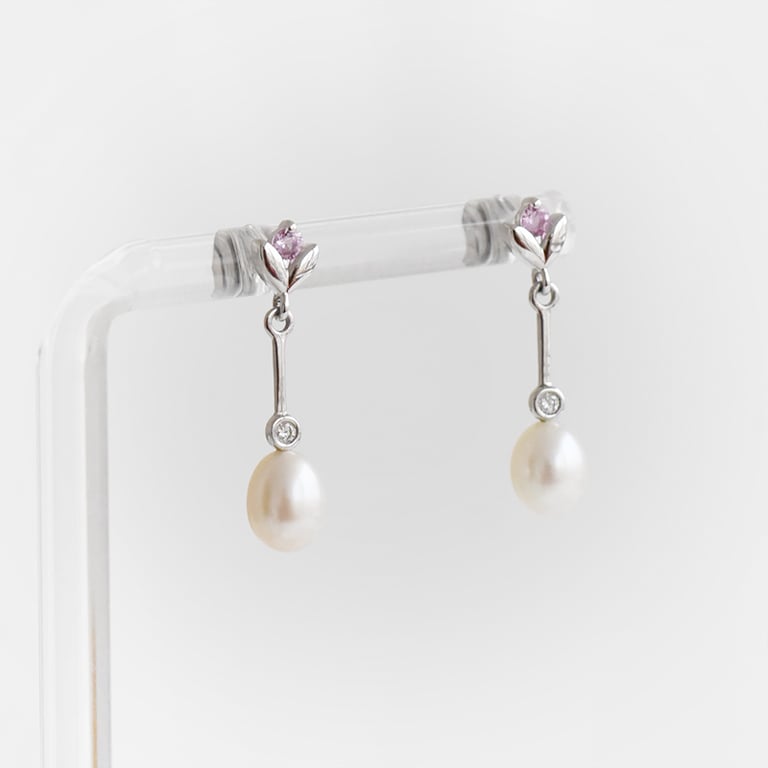 • ein wunderschöner, barock anmutender Schmuck mit ovalen, weißen, leicht rosa schimmernden Perlen, die von einem Diamanten bekrönt werden, der wiederum an einer goldenen Blume hängt, in der ein rosa Saphir aufblitzt