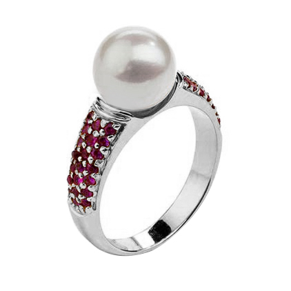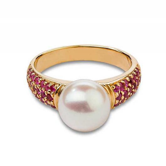 • wundervoller Goldring mit Süßwasserperle, die von Rubinen umgeben ist