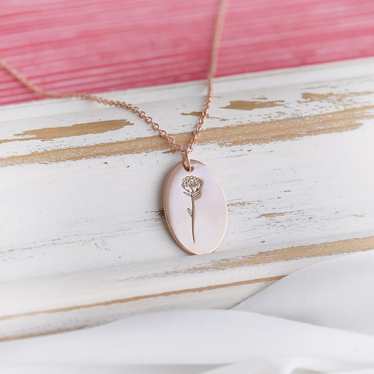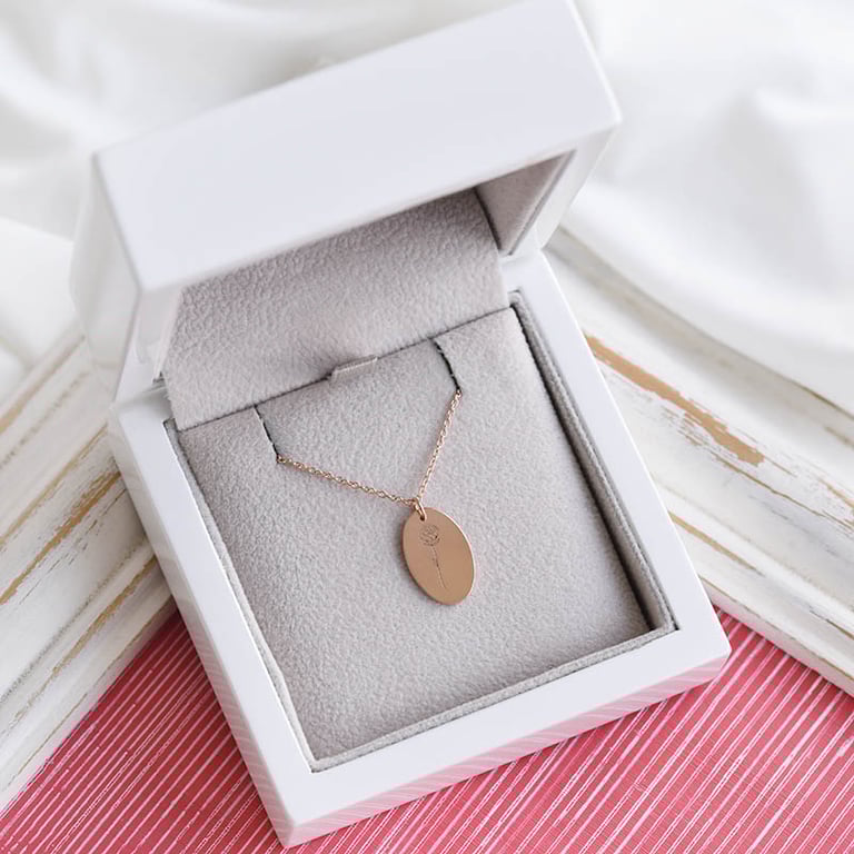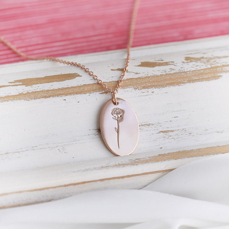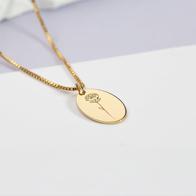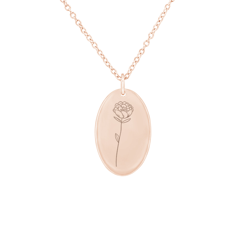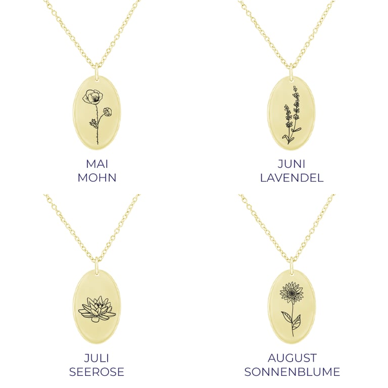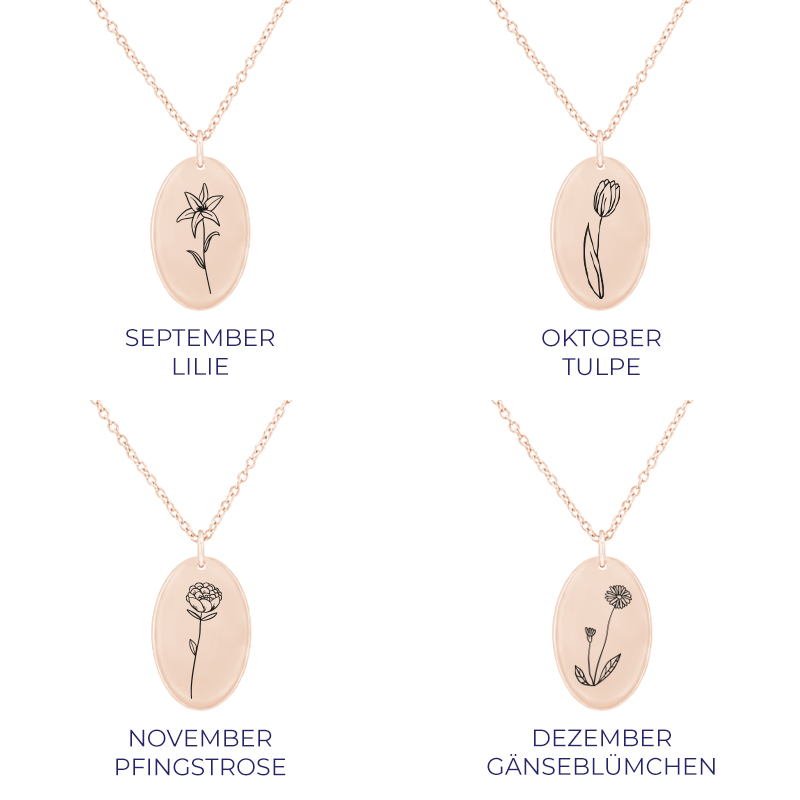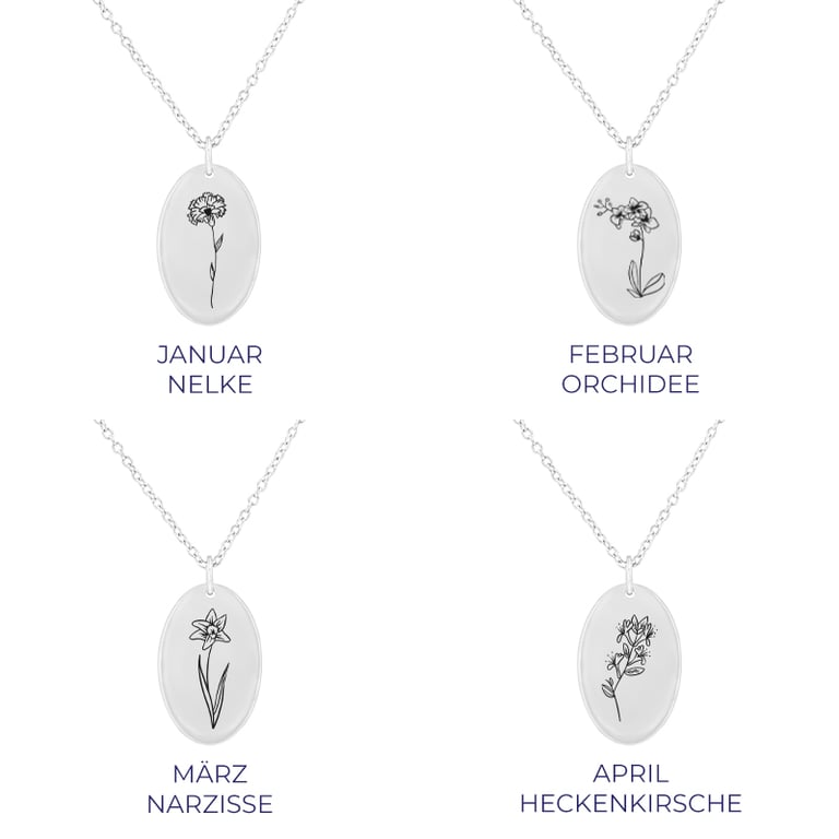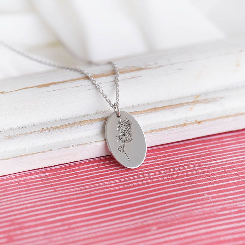 • ein kleiner ovaler silberner Anhänger mit der Möglichkeit zur Personalisierung - die Blumengravur können Sie wählen sowie eine Gravur auf der Rückseite bestimmen