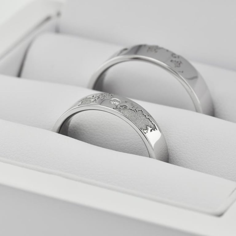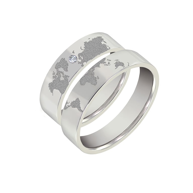 Platin-Trauringe mit Gravur der Kontinente und Diamant Zeoni