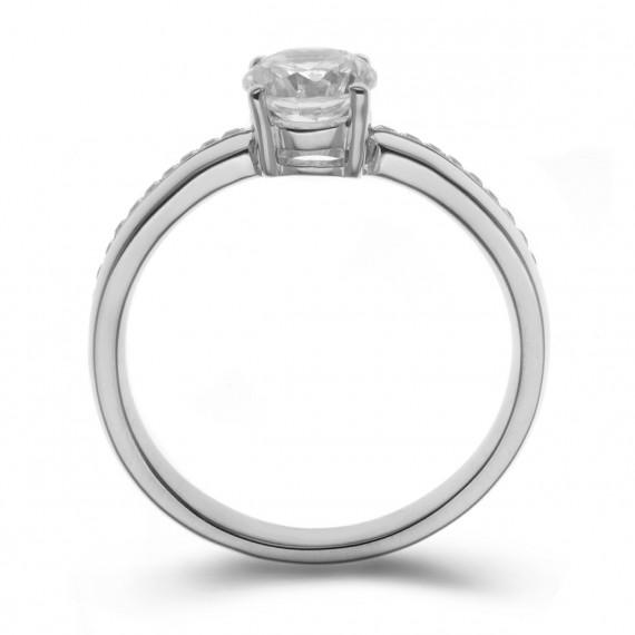 • ein großer Diamant liegt auf einer doppelten Ringschiene, die auf einer Seite mit Diamanten besetzt ist