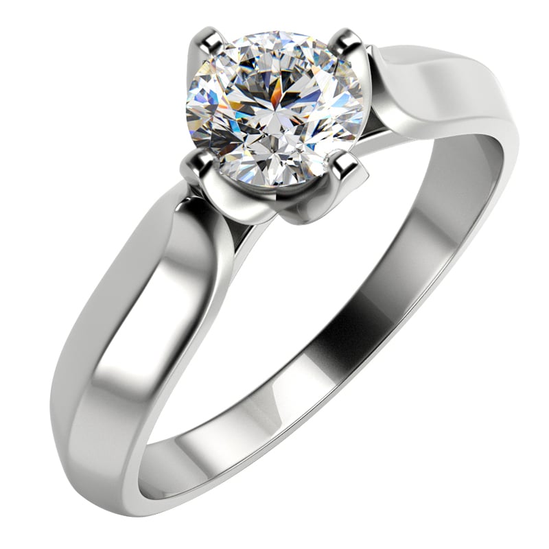 • ein runder Diamant in Spannfassung wird von einer Ringschiene in extravagantem Desig gehalten