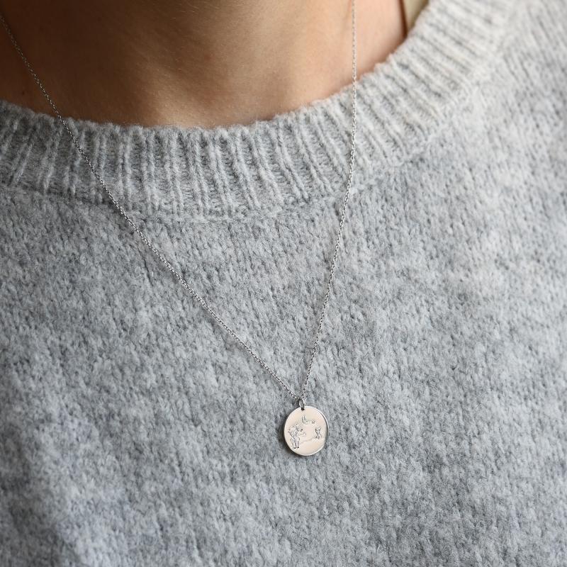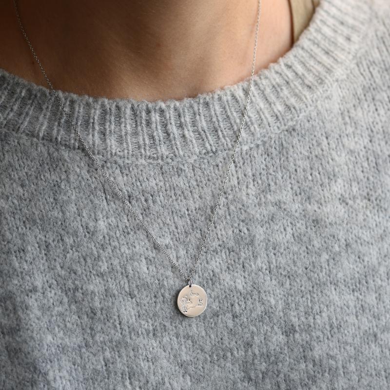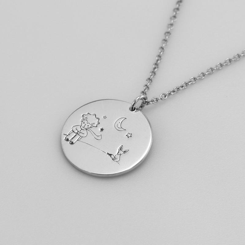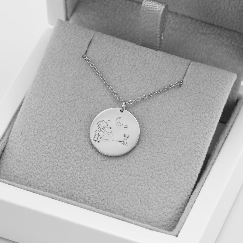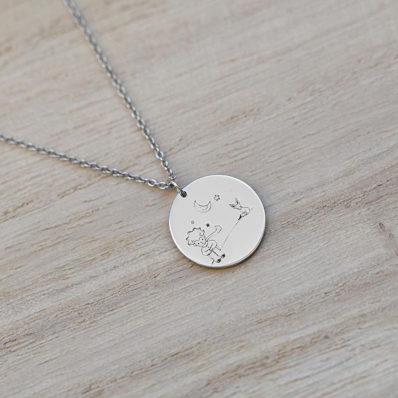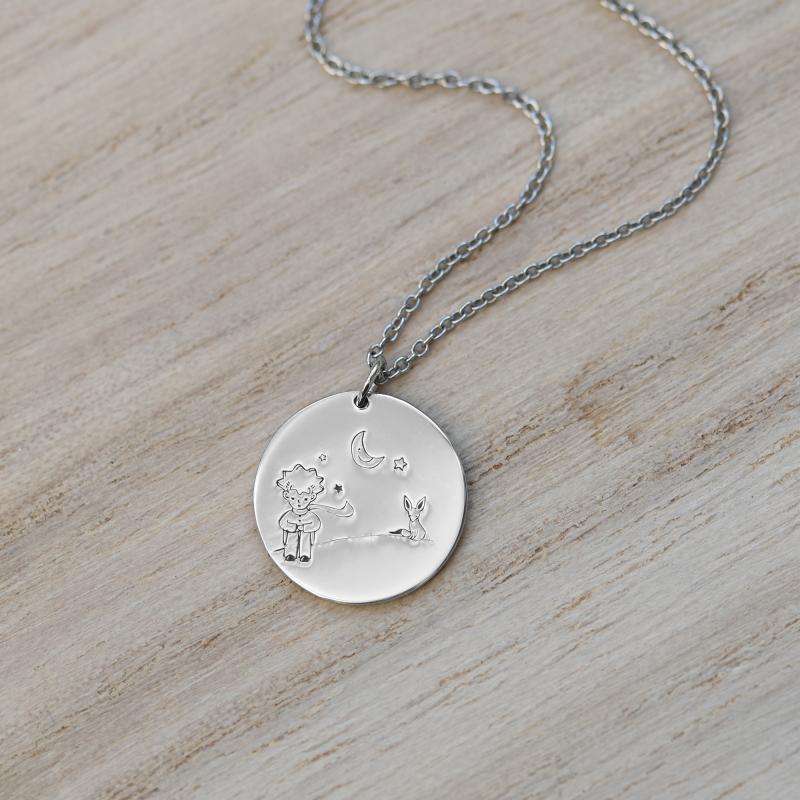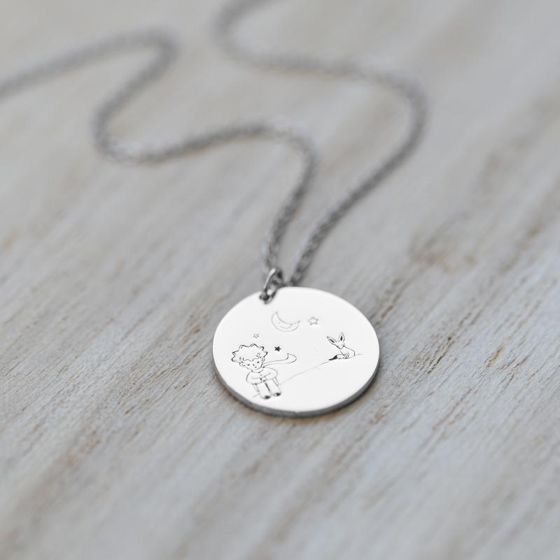 • ein zarter Anhänger verziert mit einer präzisen Gravur des Kleinen Prinzen und des Fuchses