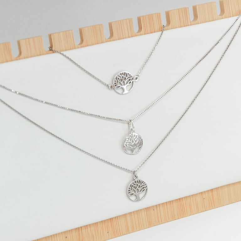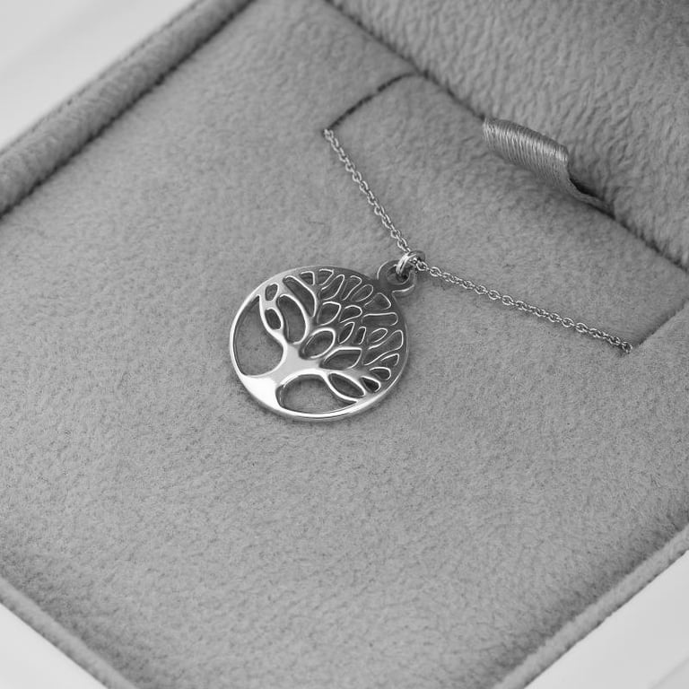 • die Platinkette hat einen Anhänger in der Form des Baumes des Lebens