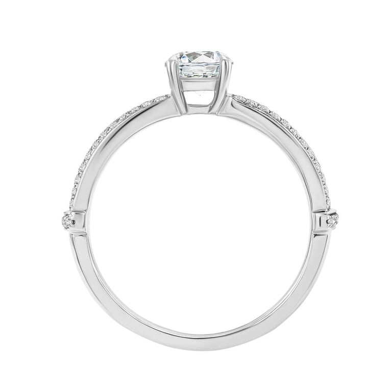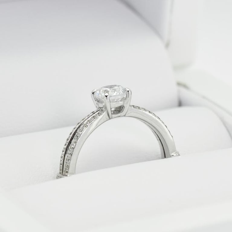 • der runde Diamant liegt auf einer Ringschiene mit einer doppelten Reihe aus Diamanten