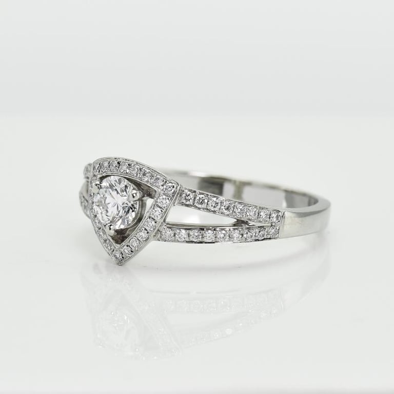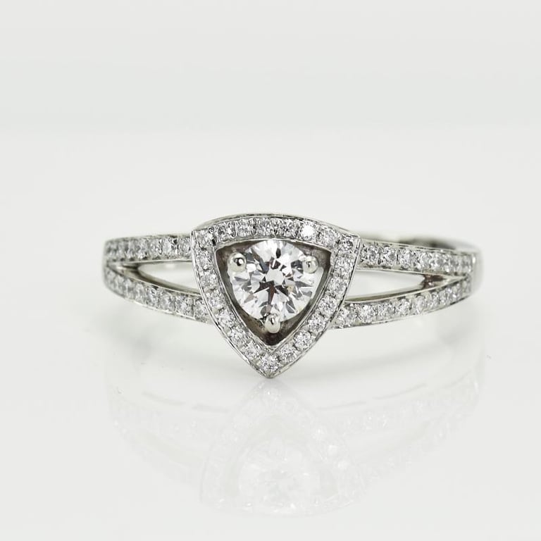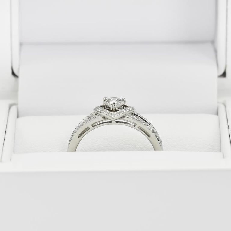 • ein runder Diamant ist in diesem Verlobungsring von einem dreieckigen Halo aus Diamanten umrandet