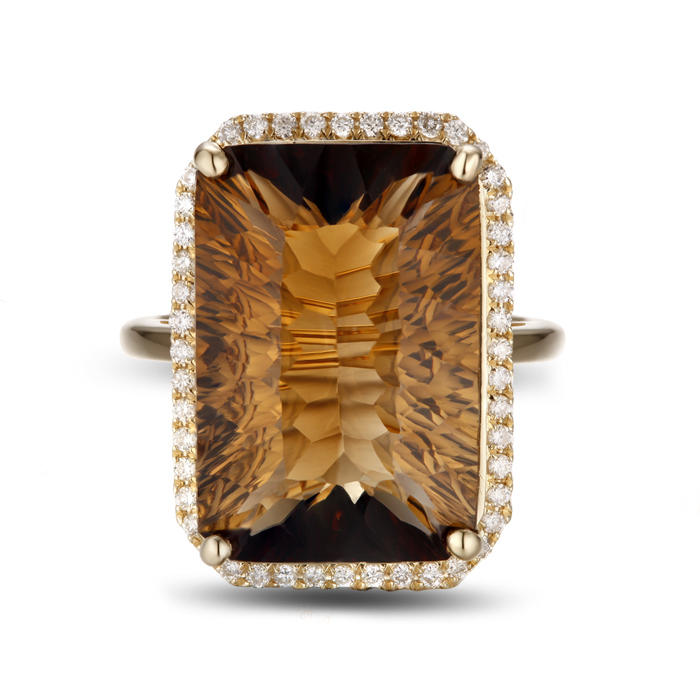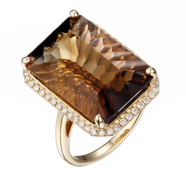 • der Rauchtopas mit einem Halo aus Diamanten ist ein richtiger Hingucker