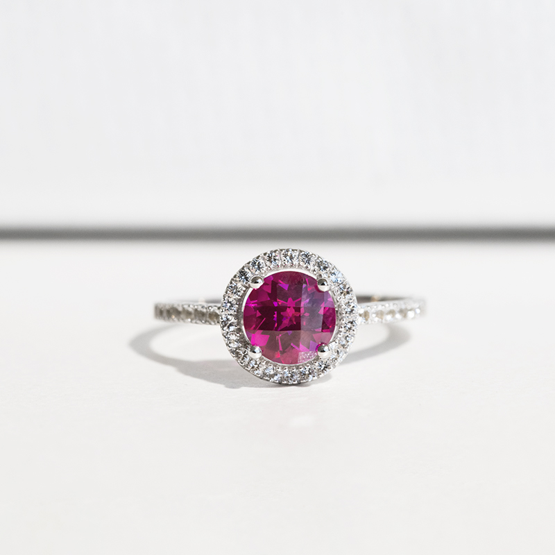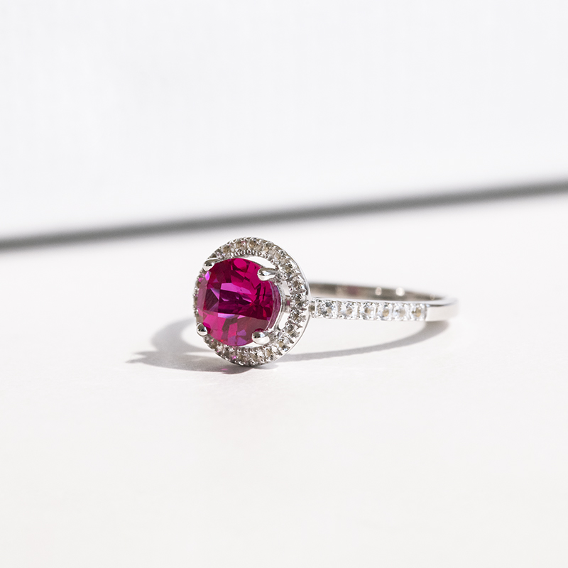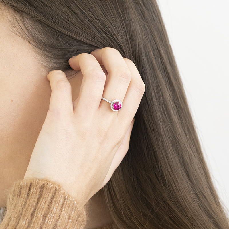 Ring aus Gold im Halo-Stil mit Rubin und Topasen Maala