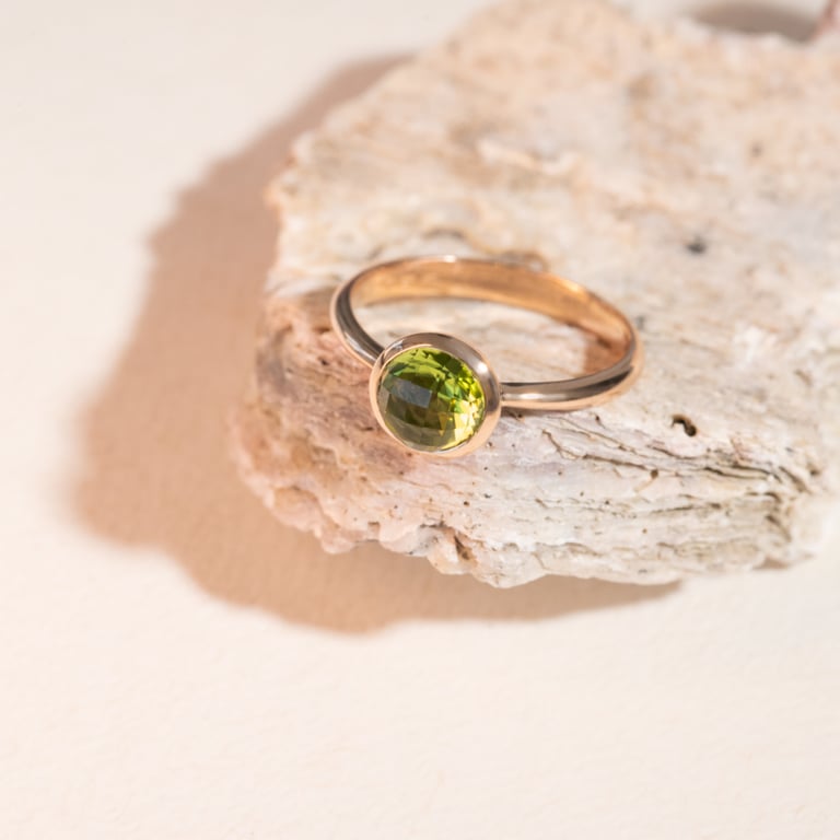 • runder Olivin von 2 Karat in 585er Roségold gefasst
