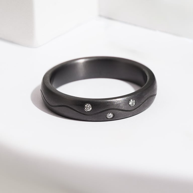 • Ring für Damen in dunkelgrauer Farbe mit ein Wellendesign, das durch 3 natürliche Diamanten ergänzt wird
