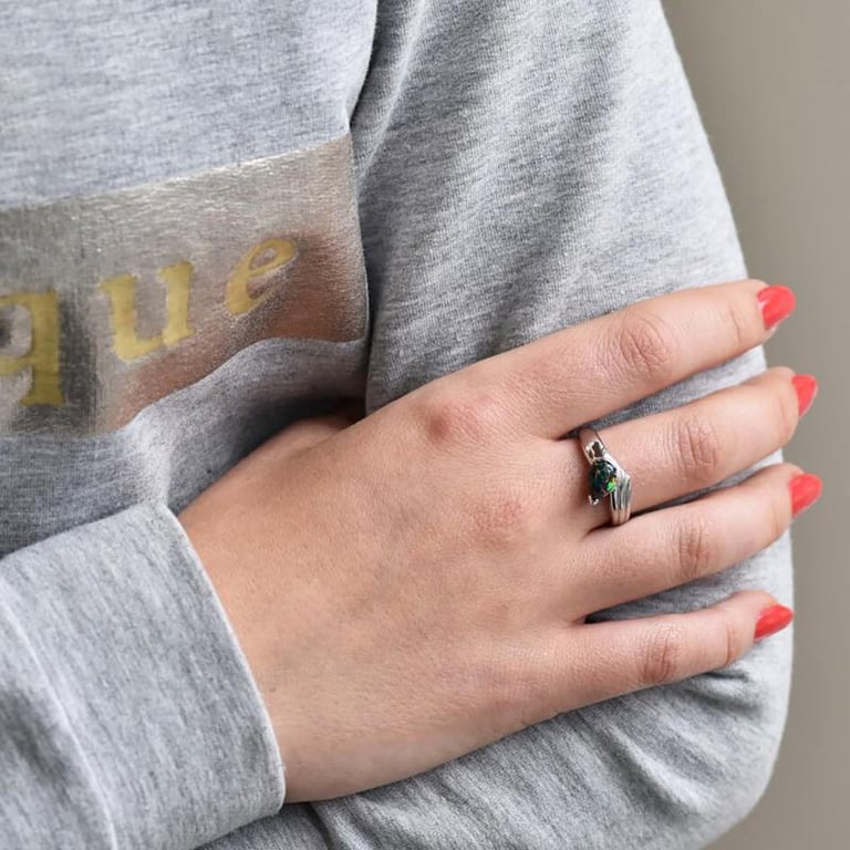 • der schwarze Opal hebt sich perfekt in der Umarmung von Silber ab
