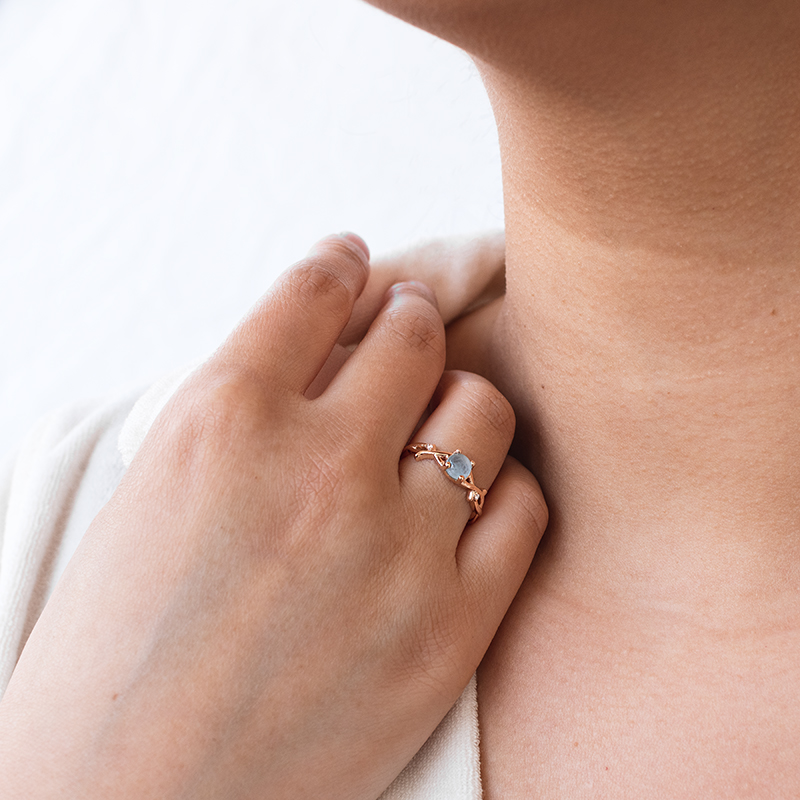 • der wie ein Zweig geformte Ring ist mit zwei Diamanten,die wie Tautropfen wirken, verziert