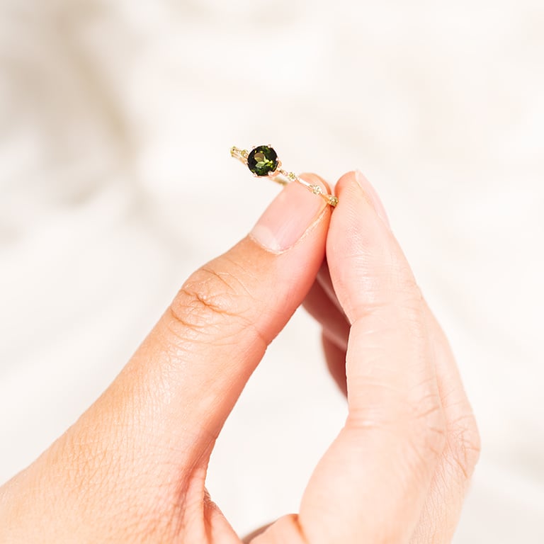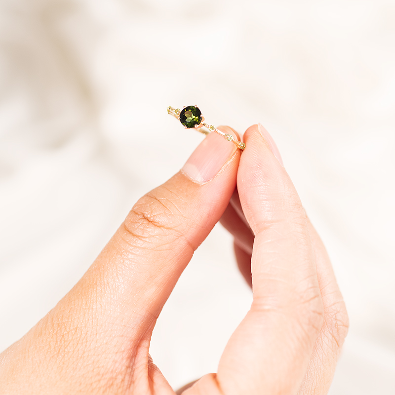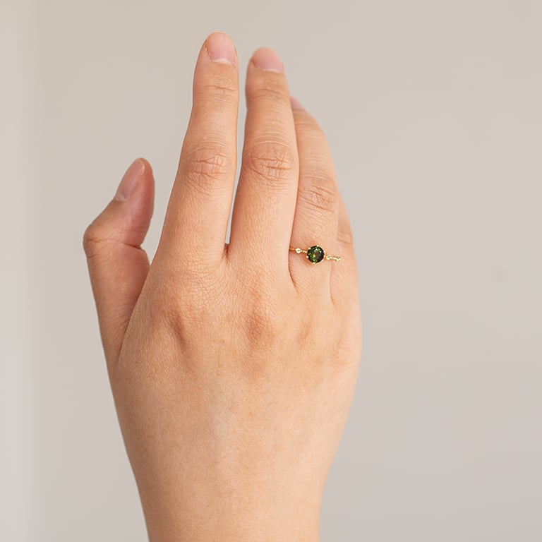 Ring mit einem grünen Turmalin und seitlichen Olivinen Imelda