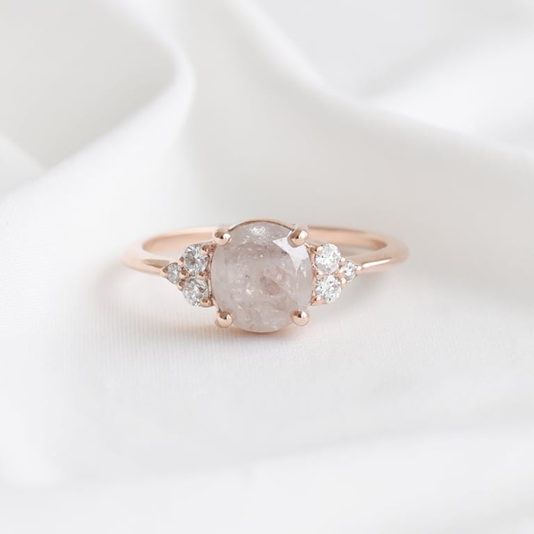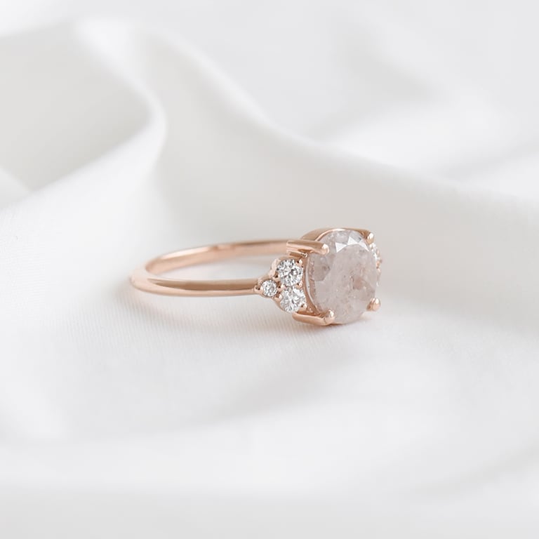 • ein zartrosa Salt and Pepper Diamant in ovaler Form, was ihn größer erscheinen lässt