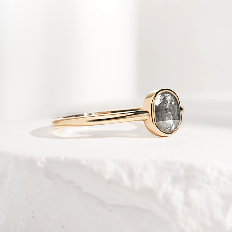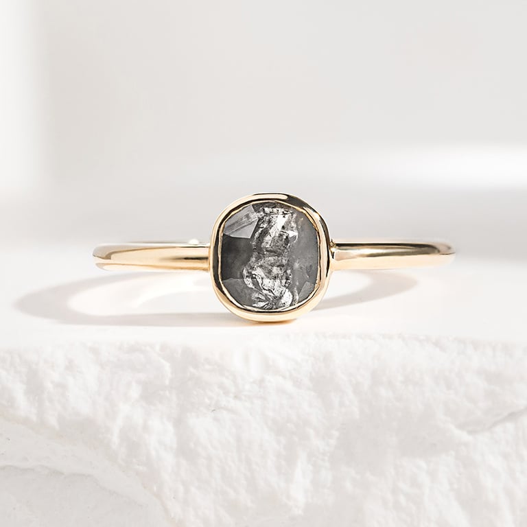 • ein einzigartiger Ring mit einem seidig grauen Salt and Pepper Diamanten in Emerald-Form