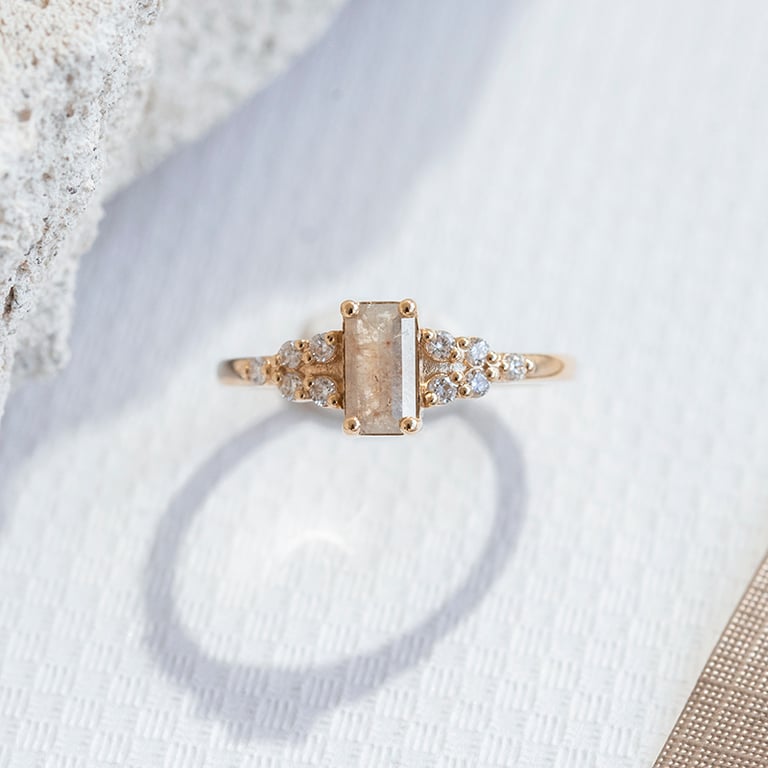 Ring mit einem Salt and Pepper Diamanten in Emerald-Form und Diamanten Mikolaj