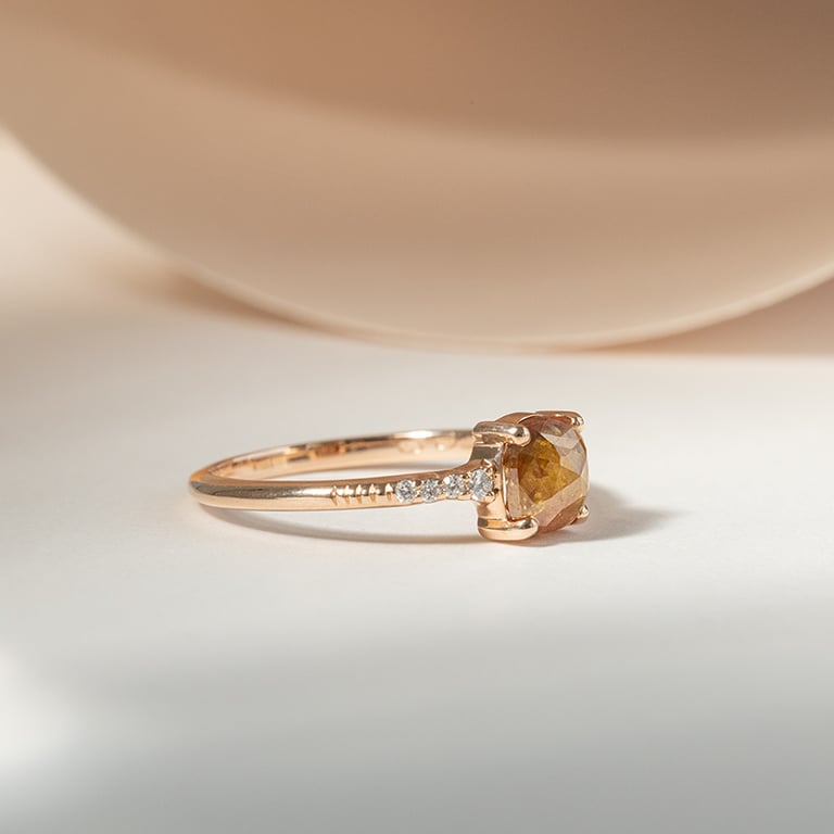 • ein Modell, das mit einem gelben Salt and Pepper Diamanten in Kissen-Form auf den ersten Blick ins Auge sticht