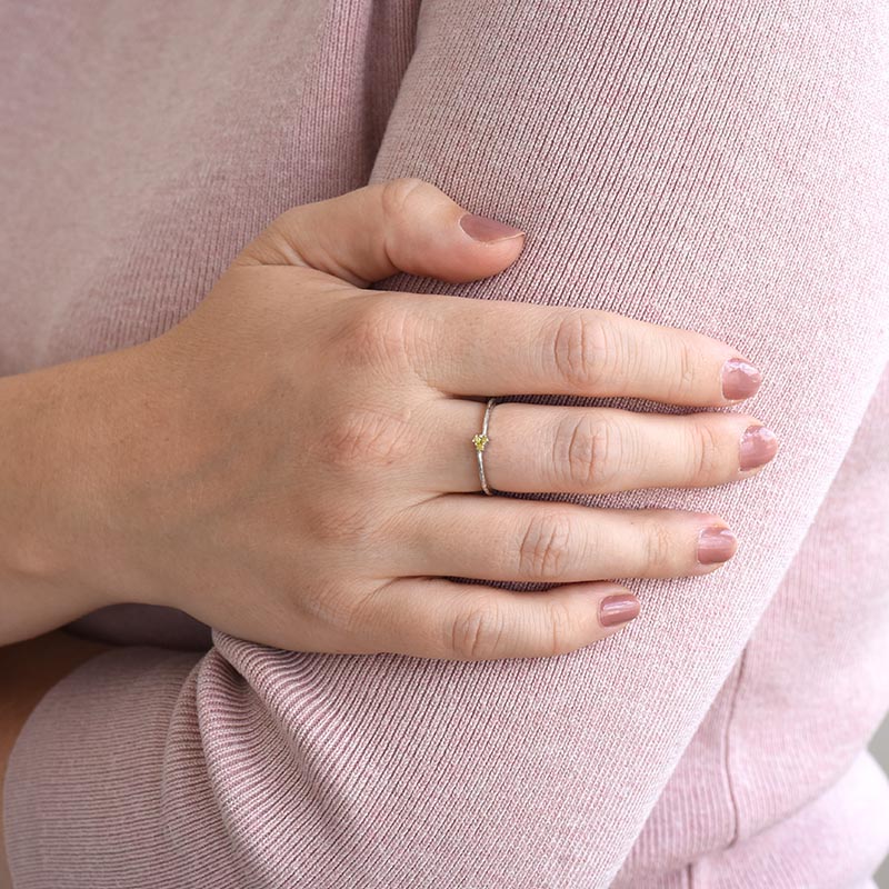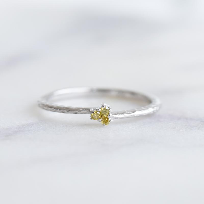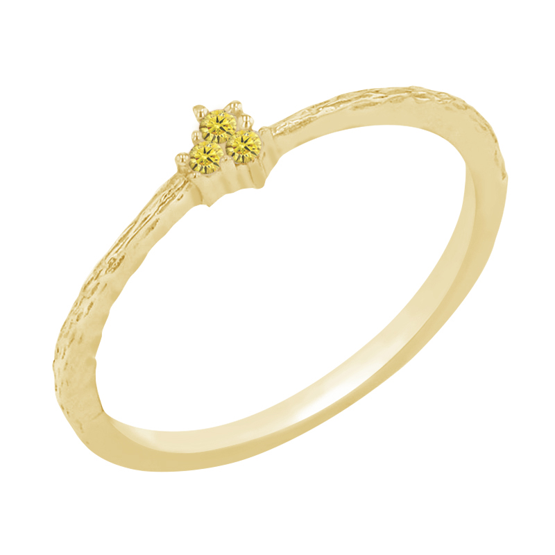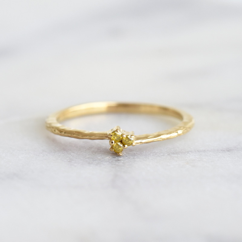 • das Trio von gelben Diamanten strahlt aus der Ferne und die gehämmerte Oberfläche verleiht dem Ring Originalität
