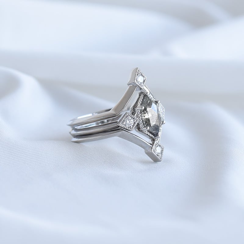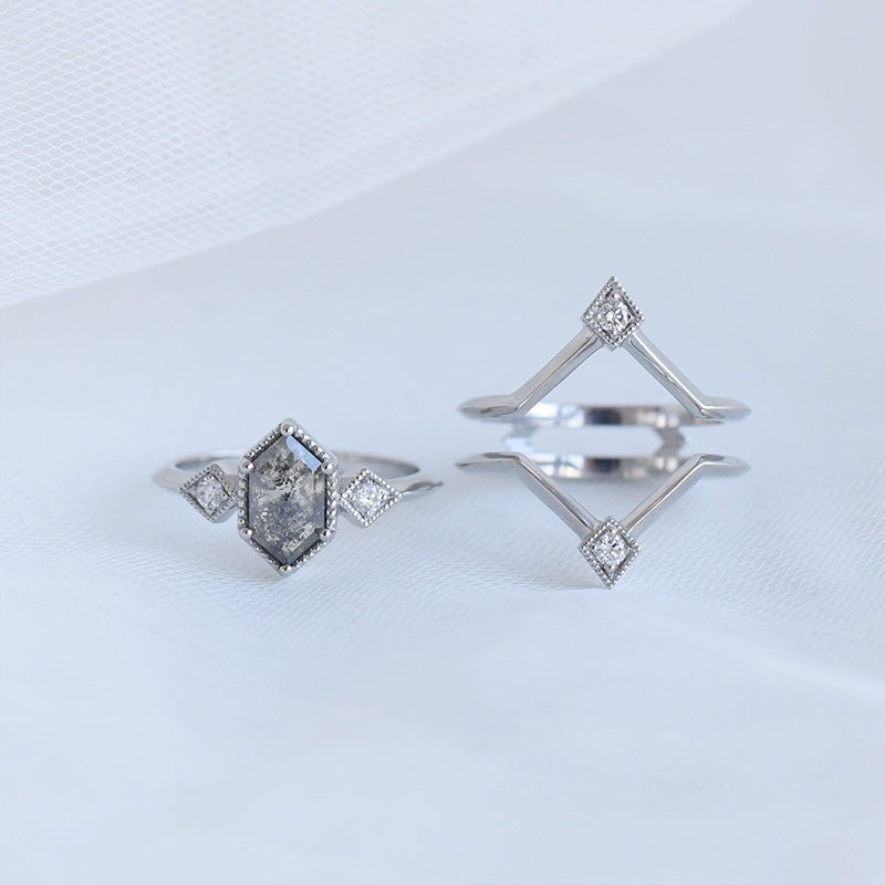 • ein grauer Salt and Pepper Diamant in Hexagon-Form dominiert den Ring in Begleitung von zwei seitlichen weißen Lab Grown Diamanten