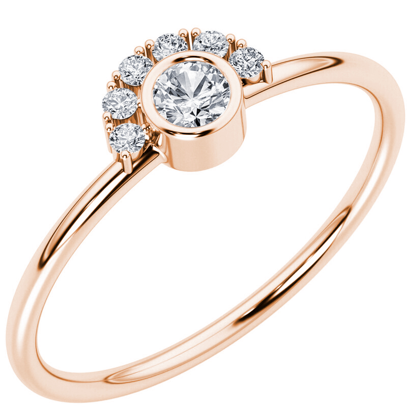 • der zentrale Lab Grown Diamant in einer sicheren Bezelfassung ist auf einer Seite von kleineren Diamanten umgeben, die in winzige Krappen gefasst sind