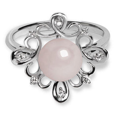 • die weiße, leicht rosa schimmernde 7.5-8 mm große Perle ist von goldenen mit acht Diamanten besetzten Mäandern wie von Blütenblättern umgeben