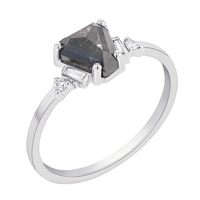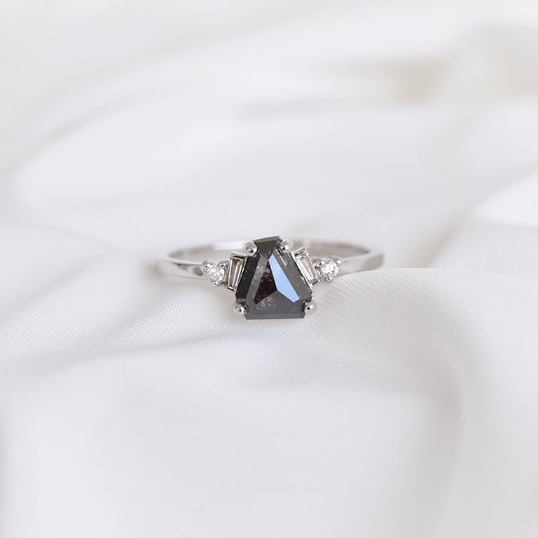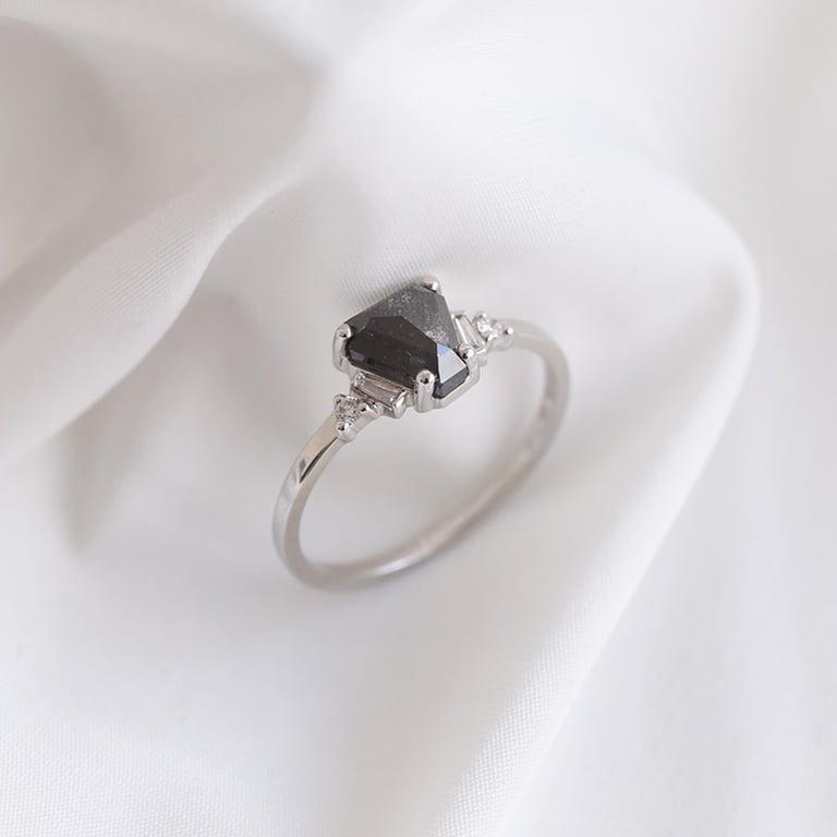 • ein samtgrauer Salt and Pepper Diamant in einer ungewöhnlichen Fünfeckform wird von zwei zertifizierten Diamanten in Baguette-Form begleitet