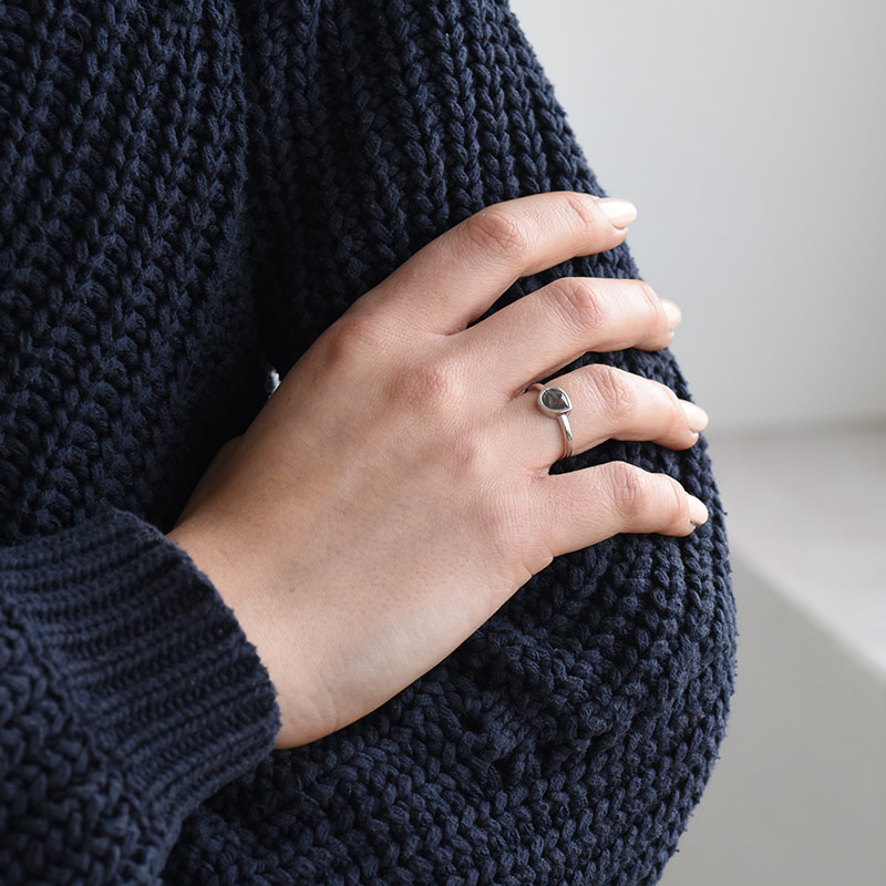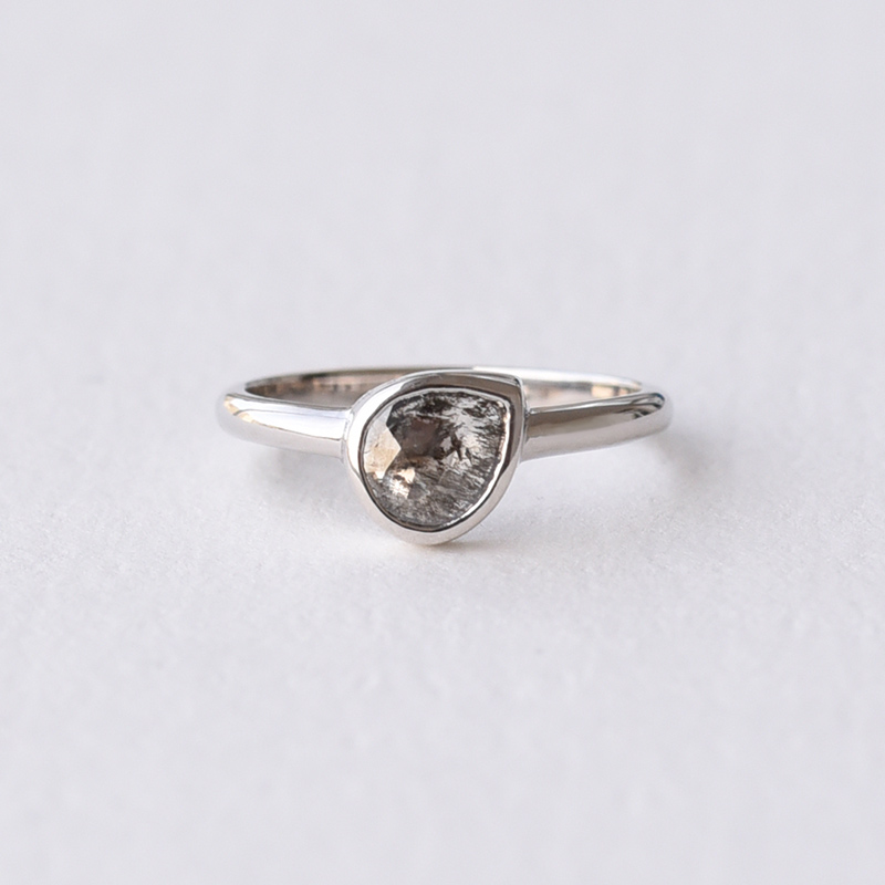 • ein minimalistischer Ring aus Gold mit grauem Diamanten in Tropfenform