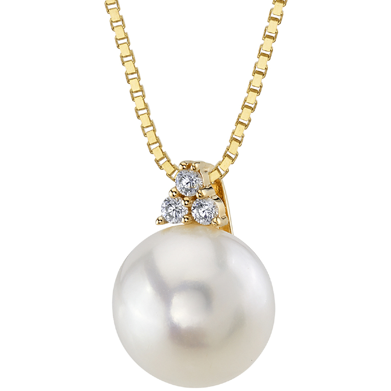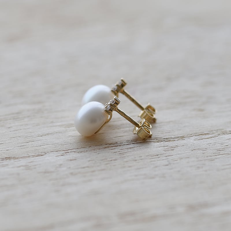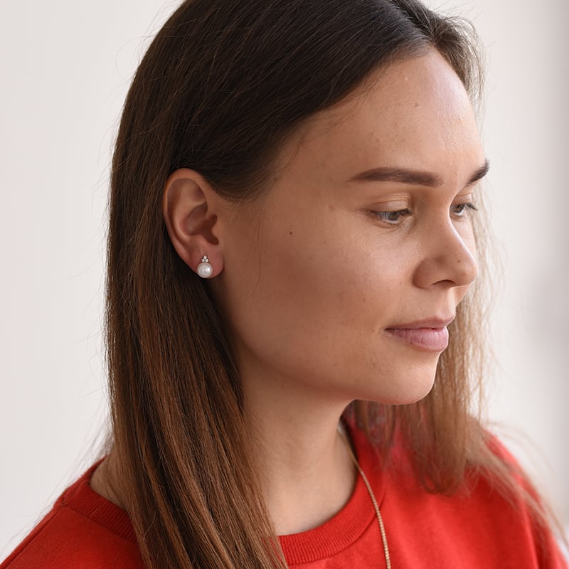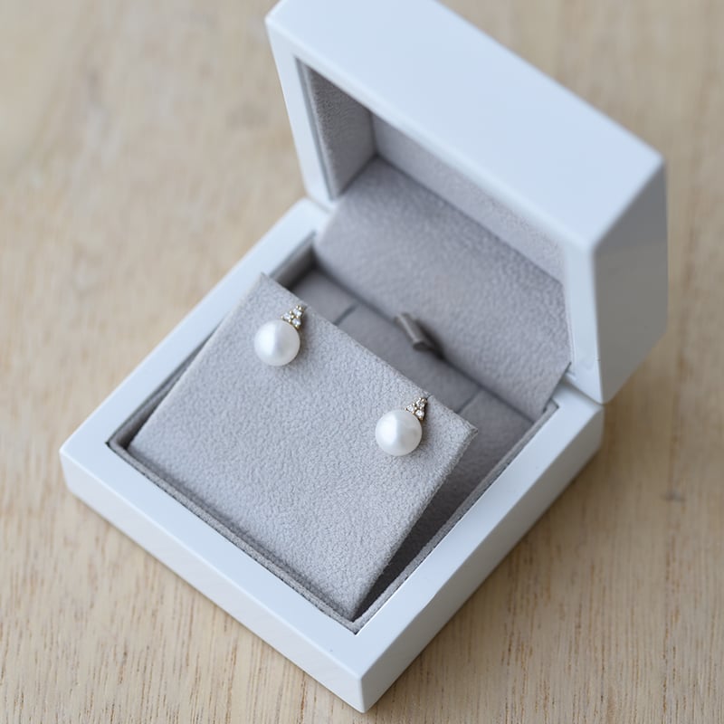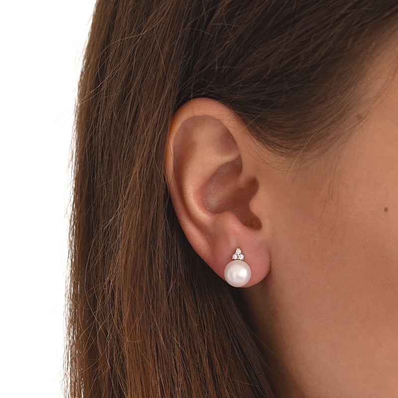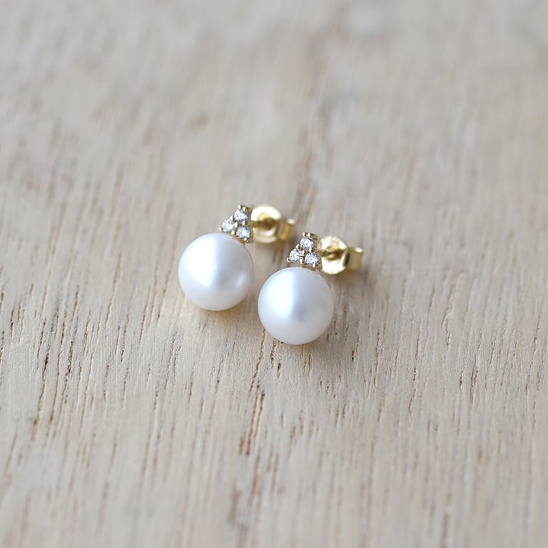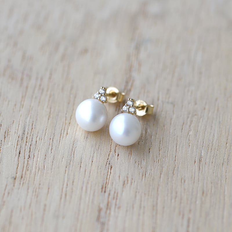• der minimalistische Schmuck hat große, runde Perlen in Weiß mit perfektem Lüster, die je von drei runden Zirkonen ergänzt werden
