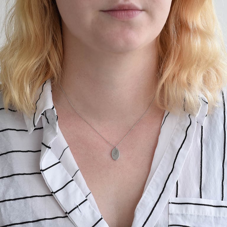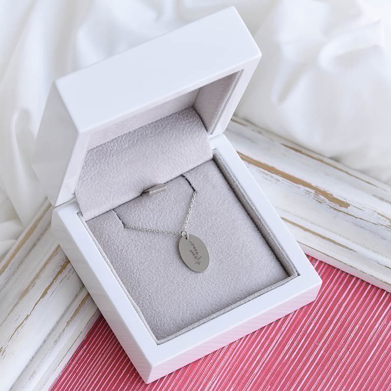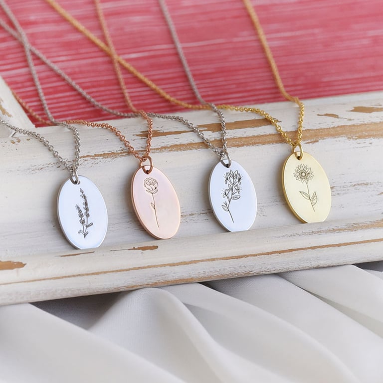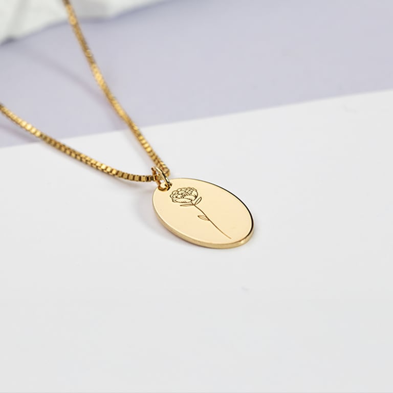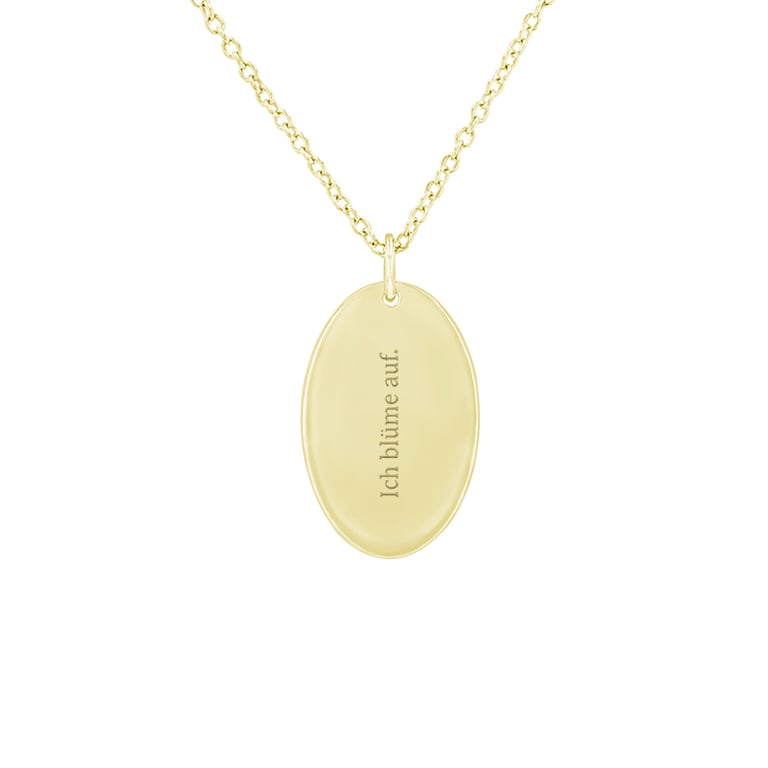 • ein kleiner ovaler goldener Anhänger mit der Möglichkeit zur Personalisierung - die Farbe des Goldes sowie die Blumengravur und eine Gravur auf der Rückseite können Sie wählen