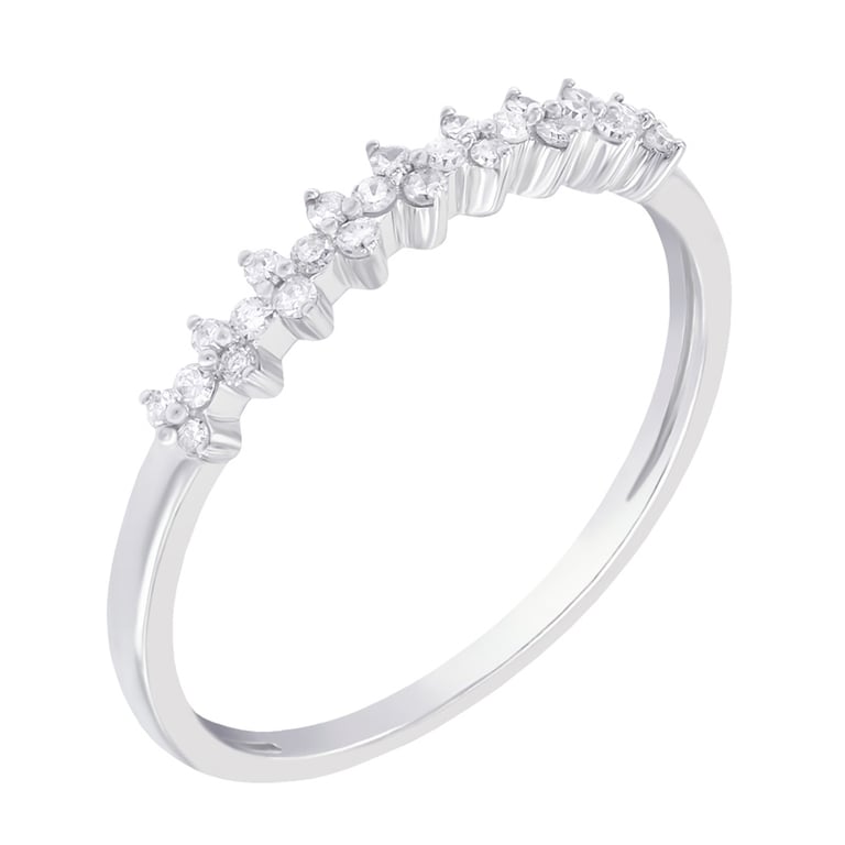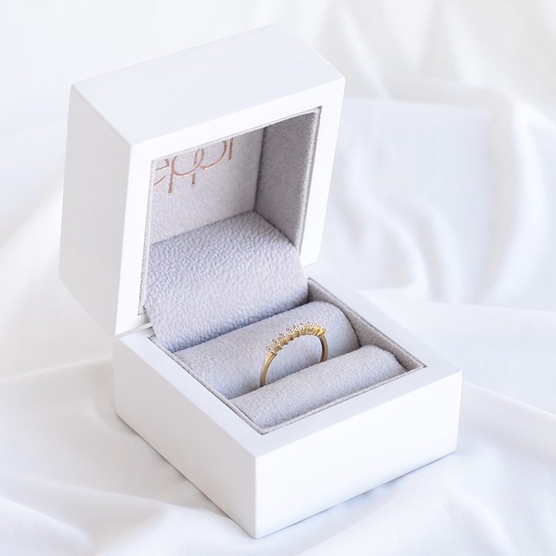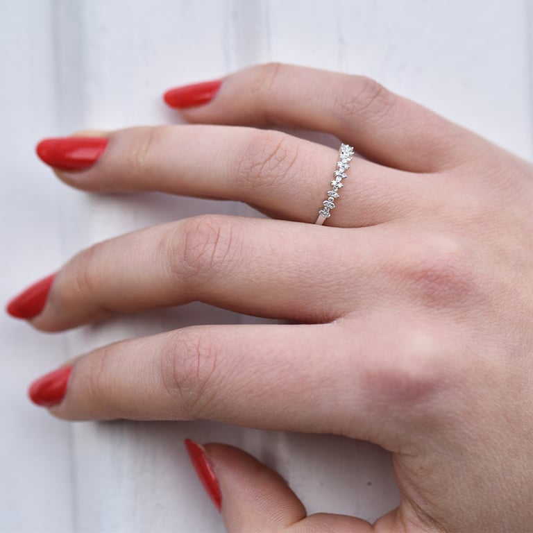 • ein zarter Ring aus recyceltem Gold oder Platin mit 26 weißen Moissaniten