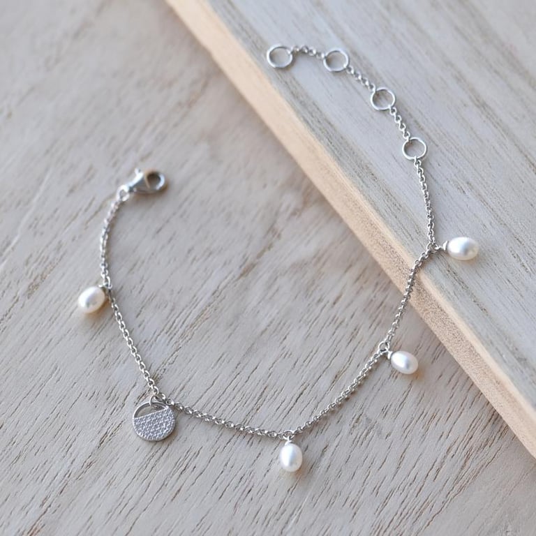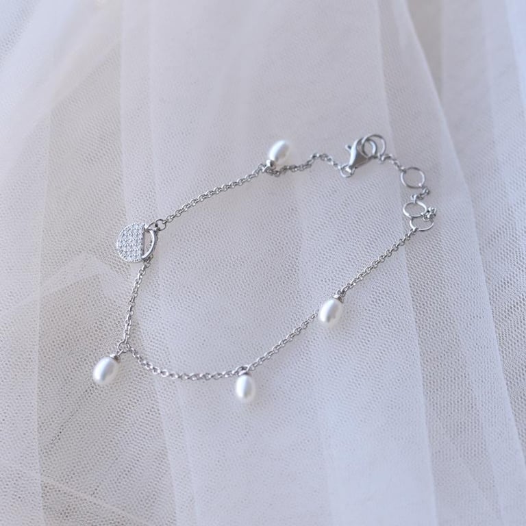 • romantisches silbernes Armband mit weißen Perlen und Zirkonia