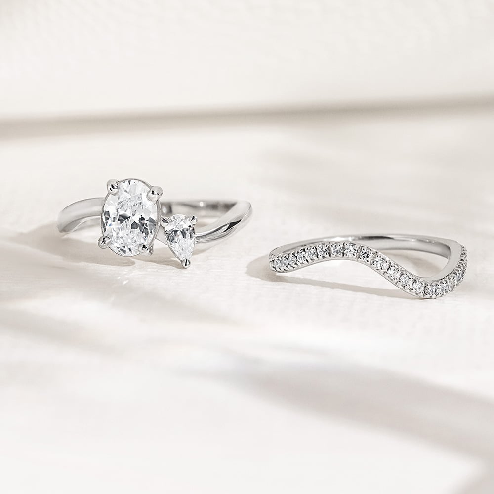 • der wunderschöne Verlobungsring ist mit zwei natürlichen Diamanten verziert - einer davon tropfenförmig, der andere oval