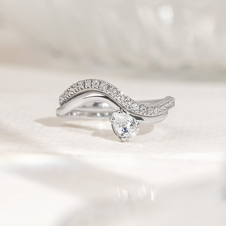 • die Einzigartigkeit des Verlobungsrings wird durch den dezenten, sanft gewellten Ehering betont, der mit kleinen natürlichen Diamanten besetzt ist