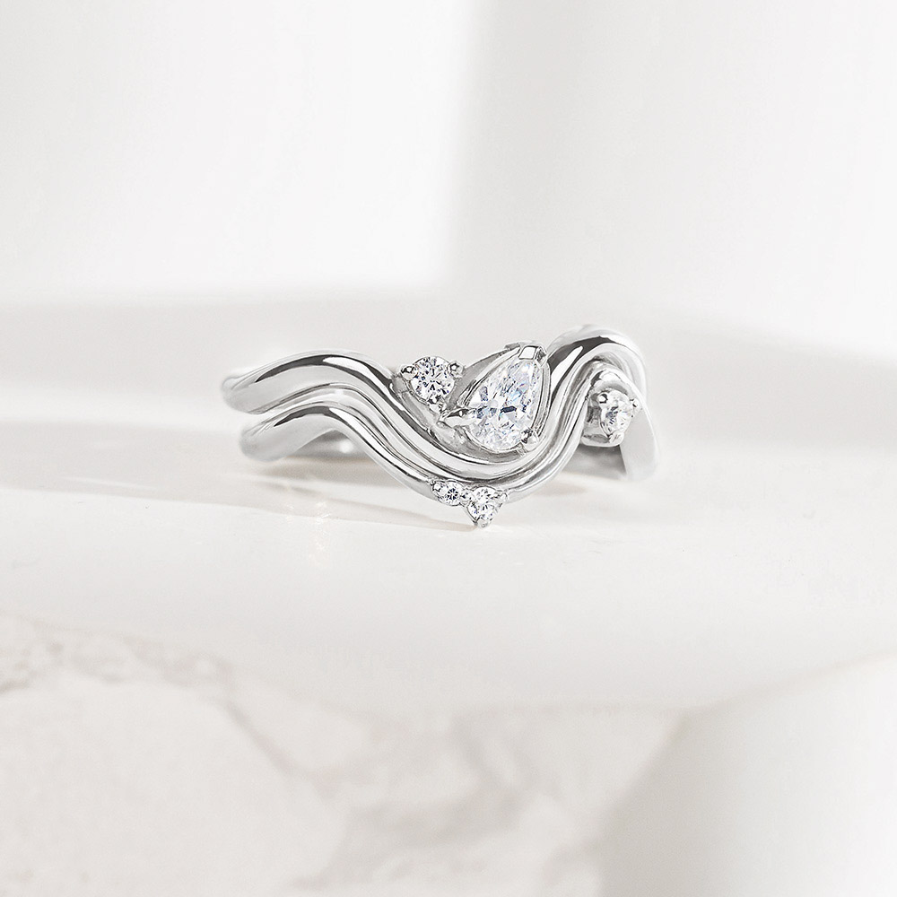 • ein romantisches Set aus gewelltem Verlobungs- und Ehering mit natürlichen Diamanten
