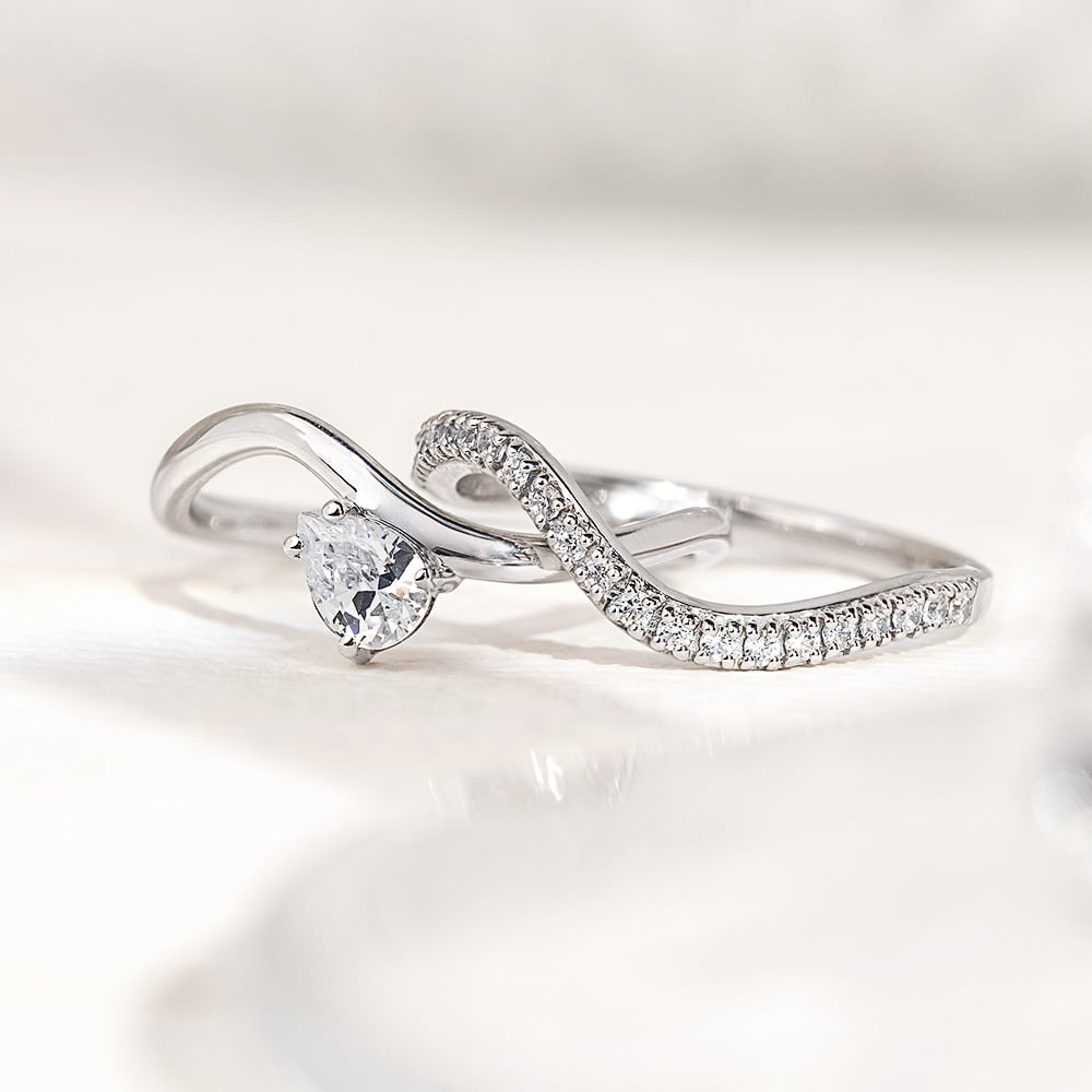 • die Einzigartigkeit des Verlobungsrings wird durch einen minimalistischen, sanft gewellten Ehering betont, der mit Lab Grown Diamanten besetzt ist