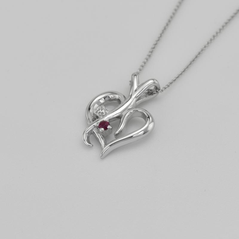 • in einem abstrakt designten Herzen ruht ein blutroter Rubin und ein funkelnder Diamant