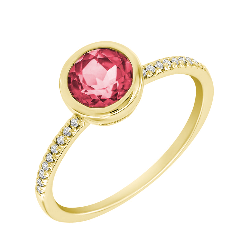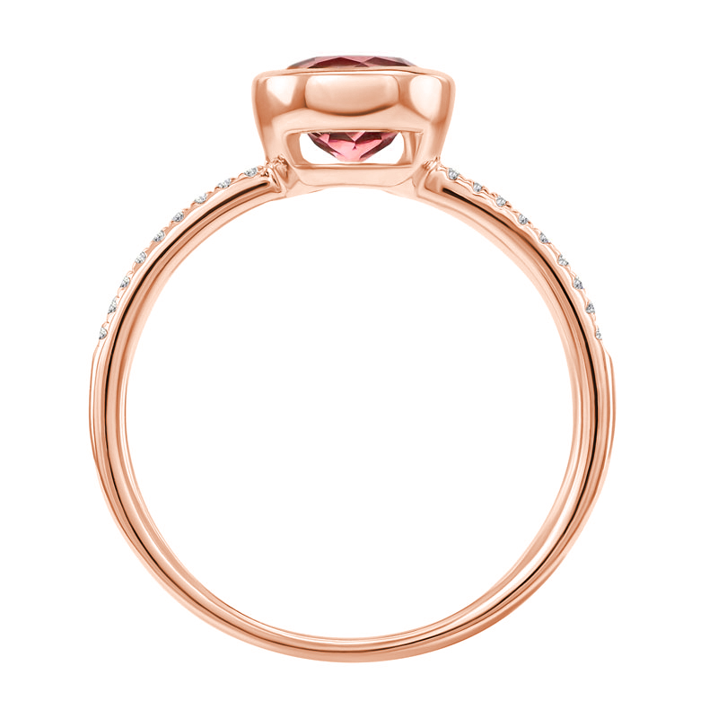 • zarter Verlobungsring mit einem runden rosa Turmalin, den eine Zargenfassung sicher hält und das Licht durchströmen lässt