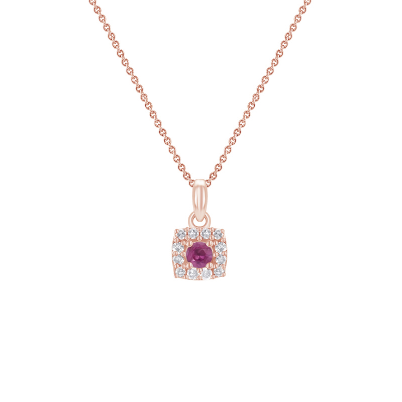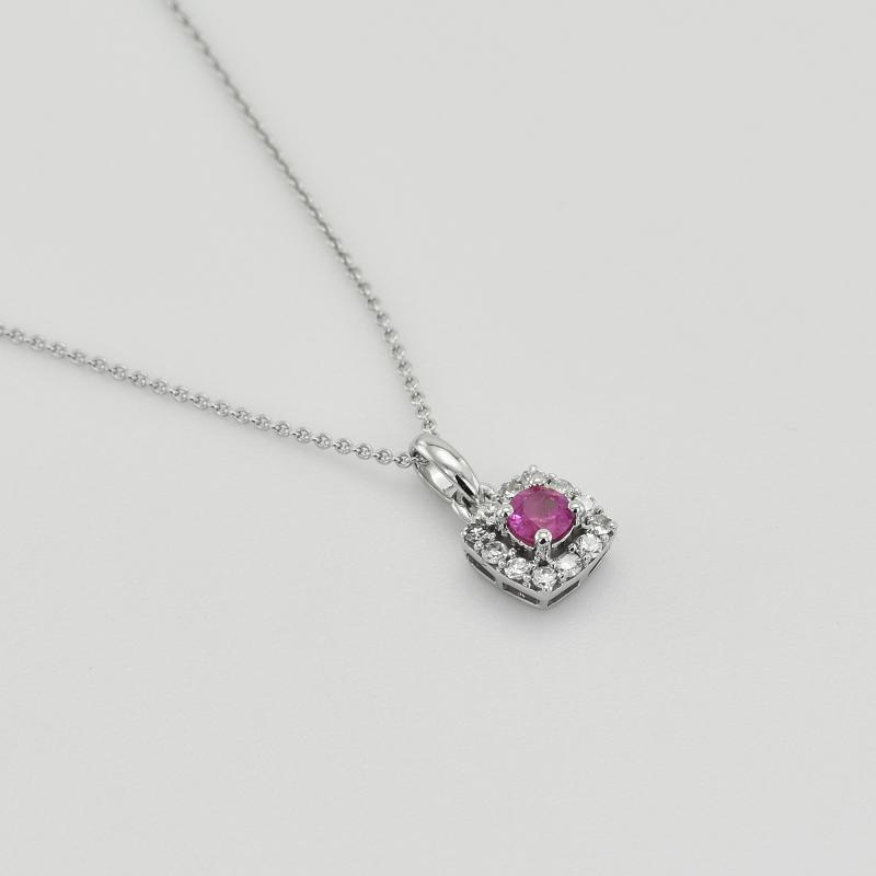 • den rosa Saphir umgibt ein eckiges, modernes Halo aus 12 natürlichen, funkelnden Diamanten
