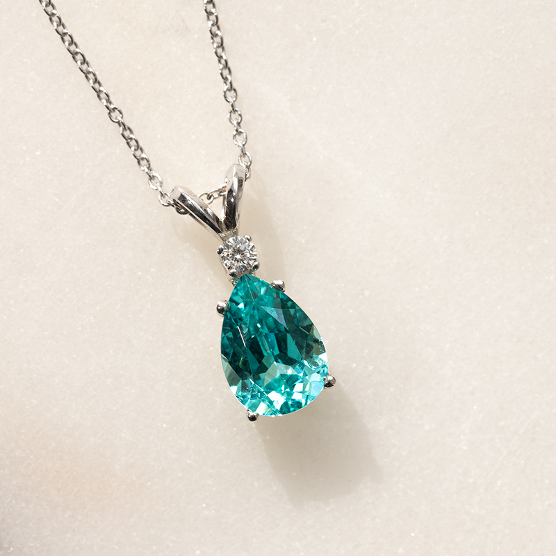 • ein im Labor hergestellter Paraiba-Turmalin in einer einzigartigen türkisen Farbe ergänzt den weißen natürlichen Diamanten im Anhänger